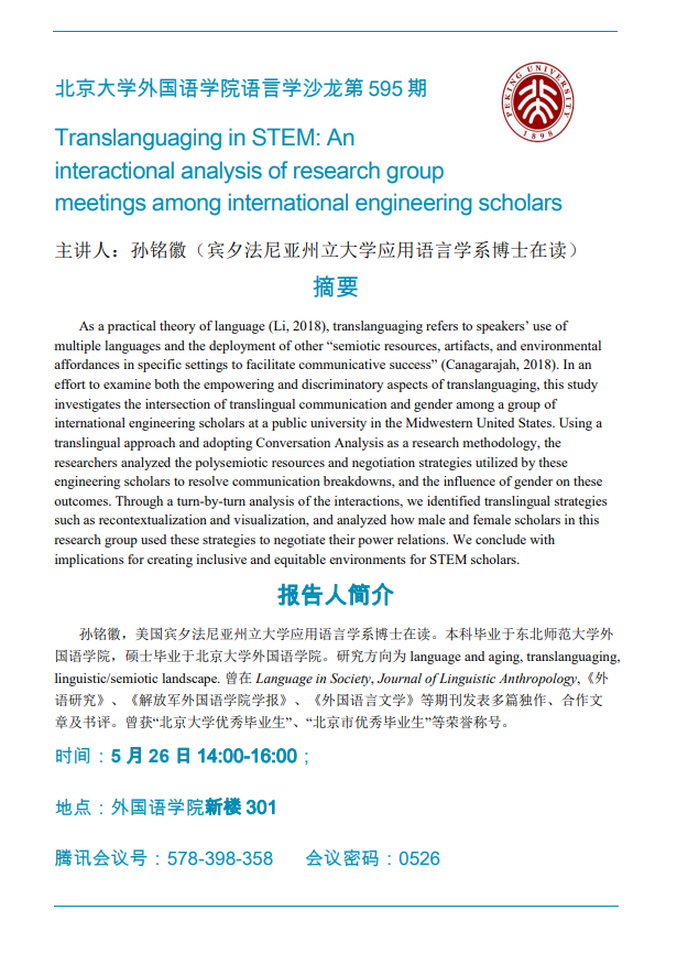 服务导航 财神在线官网语言学沙龙第595期:Translanguaging in STEM:An interactional analysis if research group meetings among international engineering scholars 2023-05-21