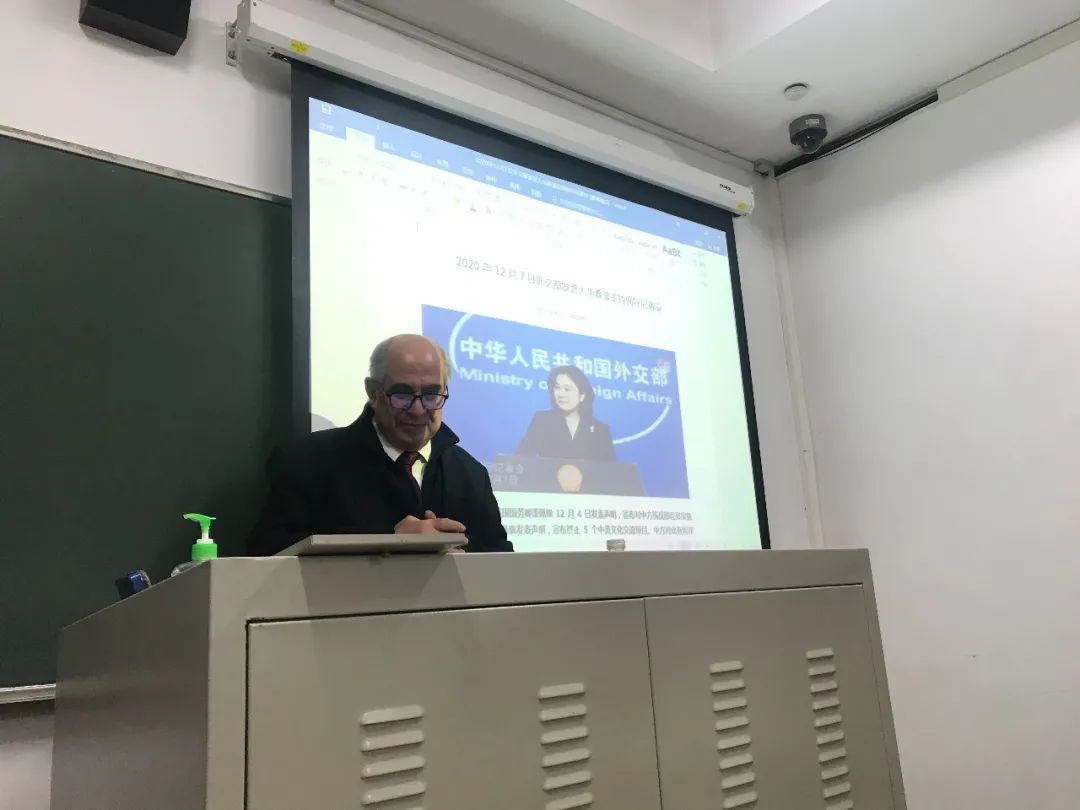 2020年12月9日上午,财神在线官网阿拉伯语系课程集群思政进课堂系列讲座邀请了阿拉伯信息中心主任、曾任教于北京大学阿拉伯语系的前巴勒斯坦驻华大使穆斯塔法•萨法里尼先生来到教室为同学们讲课。本次讲座由阿拉伯语系袁琳老师主持,林丰民教授评议。