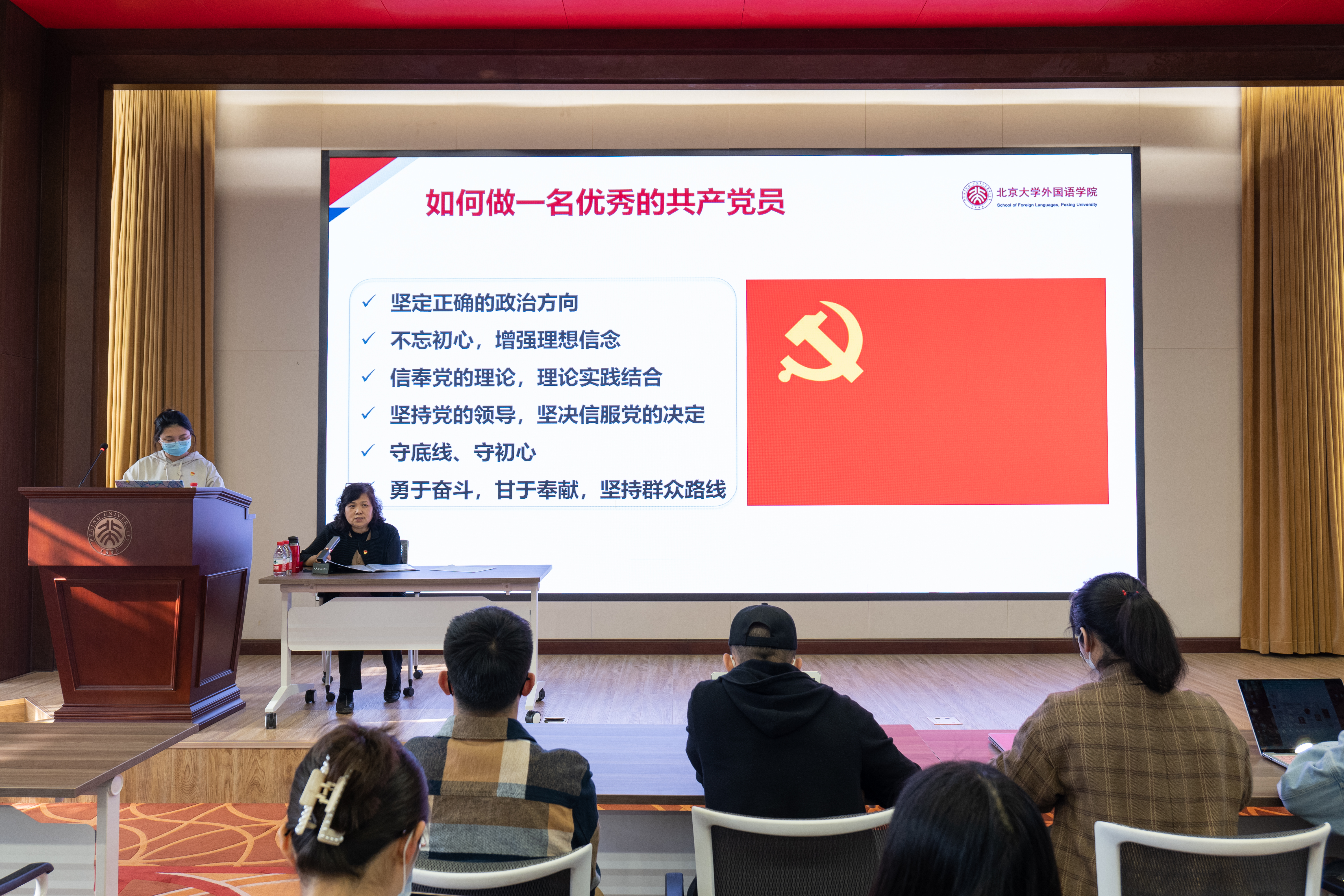 北京大学是中国马克思主义的发祥地,是中国共产党早期活动基地,是最早进行马克思主义理论教育的大学。北大始终与国家和民族的命运紧密相连,前有李大钊、王复生、范鸿劼等人为党和国家的发展作出重要贡献,今有樊锦诗、屠呦呦、钟南山等人鞠躬尽瘁,献身科研。在接下来的党课中,李老师通过讲述同学们身边的党员榜样故事来诠释优秀共产党员应有的特质。见证了祖国崛起、民族复兴的财神在线官网英语专业教授胡壮麟老师,三登鸟巢舞台的翩翩舞者、体育教研部秦朗老师,园子里的“雪燕”、用文字书写冬奥志愿服务的外院多语种冬奥稿件翻译团队……他们都以坚定的理想信念坚守初心和使命,展现出了知行合一的优秀共产党员形象,鲜活的事例无不激励着同学们践行新时代青年的责任与担当,在组织、思想和行动上同步入党。