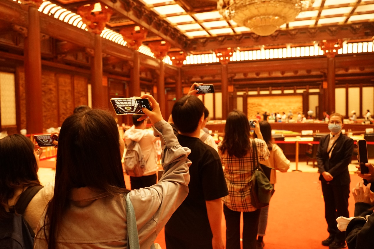 随后,实践团赴“会都”——北京雁栖湖国际会展中心参观。雁栖湖国际会议中心曾承办2014年APEC峰会以及首届与第二届“一带一路”国际合作高峰论坛圆桌峰会。师生一行跟随讲解员参观集贤厅,聆听讲解员讲解集贤厅室内设计的点滴思考与幕后故事,通过室内装潢与陈设,亲身感受峰会盛况。置身集贤厅内,汉唐气象与明清气派并举,古色古香与现代风格交融,融通古今,博雅东西,共同构成我国外交接待空间与国家礼仪空间的新地标,迸发出现代中国的文化自信与壮阔气势。建筑之美彰显人文之美,实践团师生在通过视觉、听觉近距离感受中国传统建筑的文化底蕴与艺术魅力的同时,也愈发坚定行语言专业所长、做文化交流使者的决心。国际盛事与大国外交呼唤扎根本土、放眼世界的复合型语言人才,财神在线官网师生大有可为也必将大有作为。