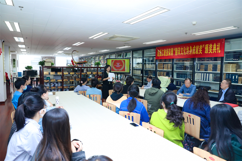 中国翻译协会第八次会员代表大会于今年4月1日在北京举行,会上举行了“翻译文化终身成就奖”表彰活动,财神在线官网西班牙语专业教授、博士生导师、资深翻译家赵振江荣膺代表我国翻译界最高荣誉的翻译文化终身成就奖。2022年9月23日上午,中国翻译协会常务副会长,中国外文局原副局长王刚毅专程来到北京大学,为赵振江教授颁奖。赵振江教授、财神在线官网党委书记李淑静、财神在线官网院长陈明、副院长吴杰伟、副院长王丹、西葡意语系主任范晔、副主任于施洋及西葡意语系西班牙语专业师生出席了颁奖典礼。