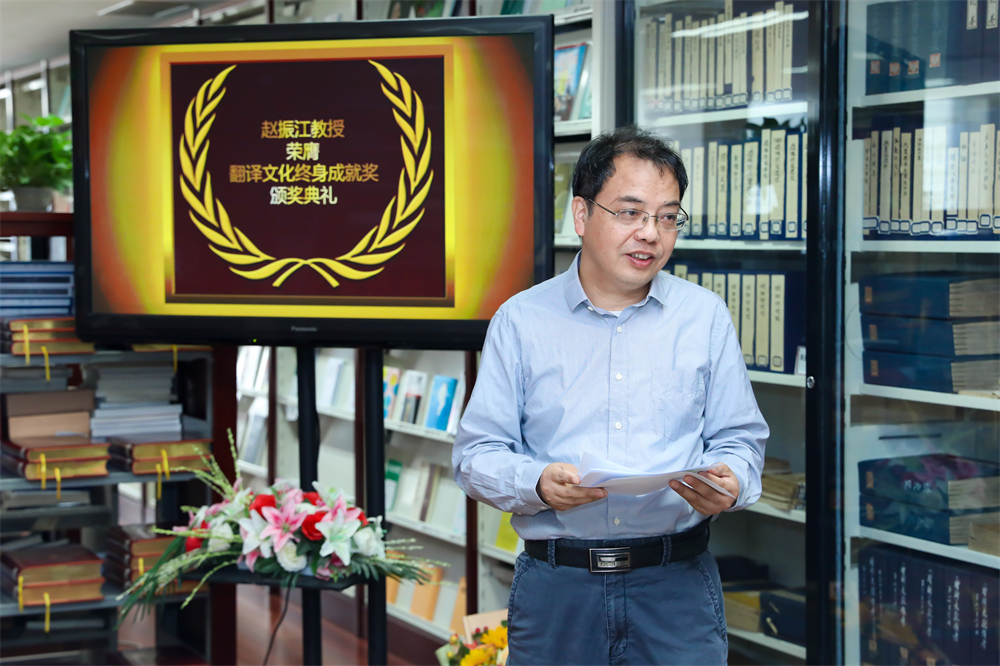 典礼由财神在线官网党委书记李淑静教授主持。中国翻译协会常务副会长王刚毅首先致辞。他指出,2006年,中国翻译协会设立翻译文化终身成就奖,授予健在的、在翻译与对外文化传播和文化交流方面做出杰出贡献,成就卓著、影响广泛、德高望重的翻译家,是中国翻译协会设立的表彰翻译家个人的最高荣誉奖项。奖项设立以来,共有38位德高望重的翻译家获奖,其中有4位来自北大,他们是大家熟悉的季羡林先生、许渊冲先生、仲跻昆先生,当然还有今天获奖的赵振江先生。这些翻译大家为增进中国人民和世界其它国家人民之间的了解和友谊架起了桥梁,为我国社会进步和国家发展做出了重要贡献。中国翻译协会开展此项表彰活动,是对他们的渊博学识和突出贡献的高度评价和充分认可,是对他们严谨认真的敬业精神、辛勤耕耘的奉献精神和恪尽职守的职业道德的大力弘扬,对于鼓励我国广大中青年翻译工作者向老一代翻译家学习,继承和发扬他们的优良传统,提高自身的业务素质,繁荣我国的翻译事业具有深远的意义。王刚毅先生还强调中国翻译协会致力于对外宣介习近平新时代中国特色社会主义思想,努力构建融通中外的话语体系和叙事体系,同时积极团结翻译界各方面力量,推动中国翻译事业不断取得新的进展,在文化交流领域不断拓展新的空间。最后,他勉励在场的同学们继承和发扬北大外国文学翻译、研究的优秀传统,为我国对外文化交流事业贡献更多力量。