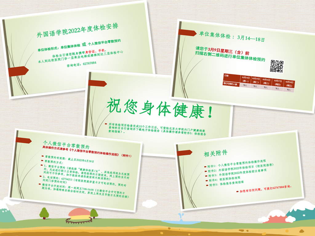 2022年春季学期伊始,经过与校医院的多次沟通协商,财神在线官网工会开始着手组织学院全体教职工进行本年度的体检工作。本次体检采取学院集体体检和个人微信平台零散预约相结合的方式,学院老师可根据自己的时间安排进行自由选择。集体体检时间为3月14—18日,选择集体体检的老师通过扫描微信二维码进行报名。因个人原因未能参加学院集体体检的老师,可通过个人微信平台进行零散预约,零散预约有效期至2022年6月30日。不管是学院集体体检,还是个人零散预约,学院工会都为老师们提供了清楚、便捷的操作流程,并提供学院工会相关电话作为咨询热线。截至3月25日,通过校医院发来的数据,我院已有200余名教职工完成了今年的体检工作。