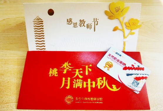 何时、以何种形式为200多名教职工发放金额100元的蛋糕卡,如何能将这个小小的福利发放得更有意义,是外院工会人一直在思考的一个问题。在学院工会主席、副院长张冬梅老师的指导下,外院工会人将发放蛋糕卡的时间安排在今年教师节暨中秋节的前一天。和以往仅发放一张蛋糕卡不同,这一次,外院工会人为每位教职工准备了精美的教师节贺卡,里面装着蛋糕卡(选择蛋糕卡的老师)和一枚实用的、经过特别设计的海棠花形状的书签——好似在呼应外文楼前那一排每年都会盛放的西府海棠。外院工会人的细心和用心,由此可见一斑。