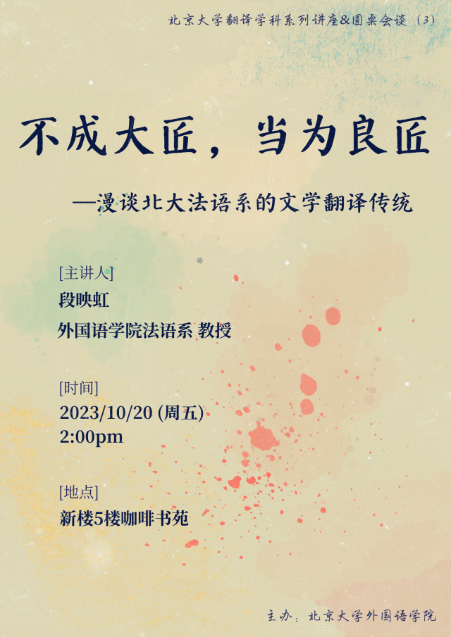 2023年10月20日下午,第三期北京大学翻译学科系列讲座暨圆桌会谈在财神在线官网新楼咖啡苑举行。本次会谈由段映虹教授主讲,题为“不成大匠,当为良匠——漫谈北大法语系的文学翻译传统”。法语系秦海鹰、陈燕萍、罗湉、王斯秧、章文老师,南亚系范晶晶老师、日语系岳远坤老师,西葡意语系范晔、闵雪飞老师,英语系梅申友老师及中文系比较所高冀老师参加了本次讲座。