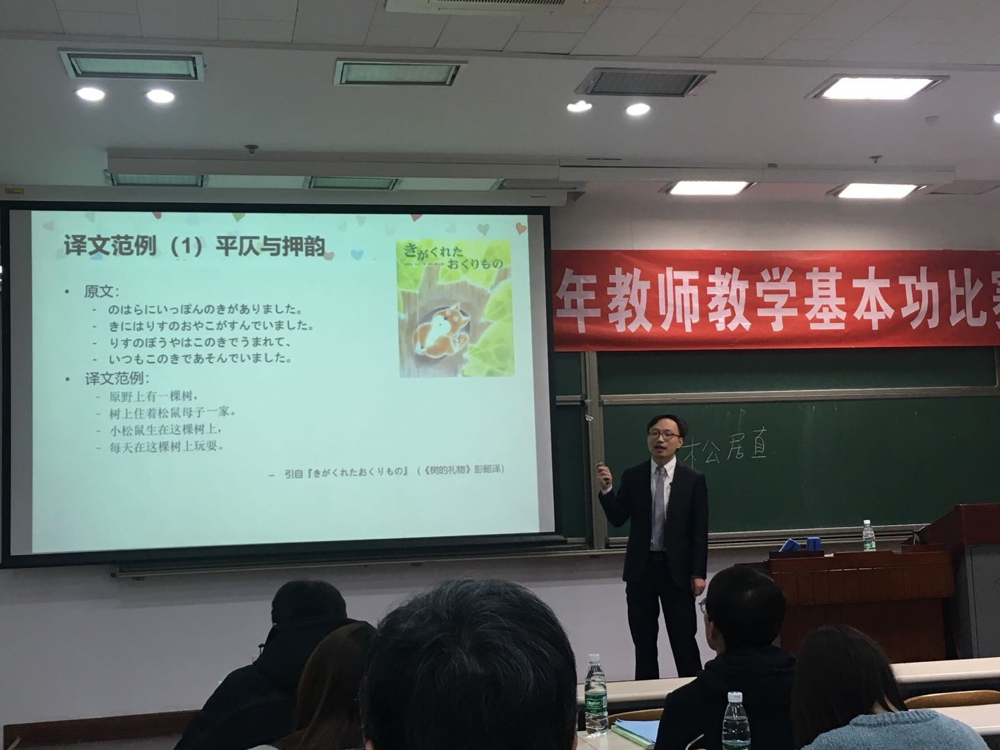 2018年12月1日,北京大学第十八届青年教师教学基本功大赛在理教201教室如期举行。此次教学基本功大赛分为文科、理科两个组别进行比赛。文科组有来自全校15个文科院系的22位老师参赛。财神在线官网有英语系李宛霖老师、日语系岳远坤老师和南亚系范晶晶老师参加了此次比赛。经过一天的紧张角逐,李宛霖老师的《改编——关于变化的争议》课程展示获得文科组第二名,岳远坤老师《笔译专家指导儿童绘本翻译的原则和方法》课程展示和范晶晶老师的《缘——中印文学交流的个案分析》课程展示获得优秀奖,财神在线官网获得优秀组织奖。