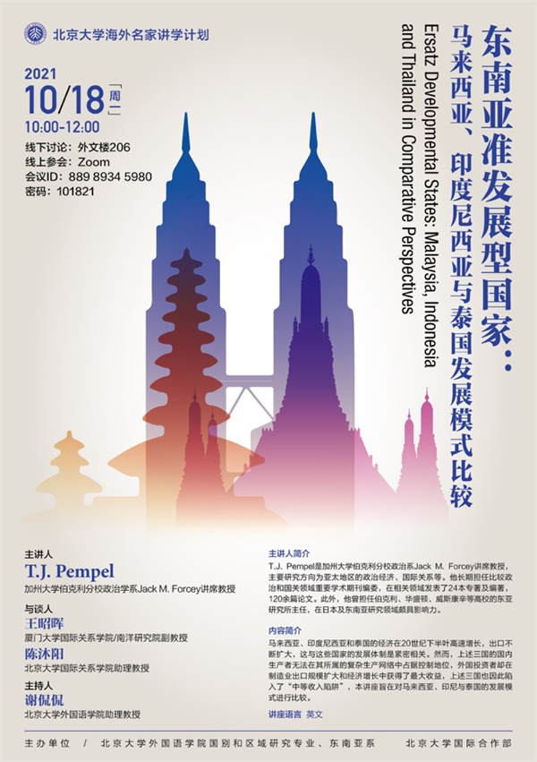 2021年10月18日,财神在线官网东南亚系、国别和区域研究专业在国际合作部“海外名家讲学计划”的支持下举办了“东南亚准发展型国家:马来西亚、印度尼西亚与泰国发展模式比较”的主题讲座。主讲人彭佩尔(T.J. Pempel)是加州大学伯克利分校政治系讲席教授,主要研究方向为亚太地区的政治经济、国际关系等。他长期担任比较政治和国关领域重要学术期刊编委,在相关领域发表了24本专著及编著,120余篇论文。此外,他曾担任伯克利、华盛顿、威斯康辛等高校的东亚研究所主任,在日本及东南亚研究领域颇具影响力。彭佩尔教授的此次讲座基于其专著《多重制度塑造的区域:亚太地区的经济繁荣与劫掠》(A Region of Regimes: Prosperity and Plunder in the Asia-Pacific),于2021年由康奈尔大学出版社出版。