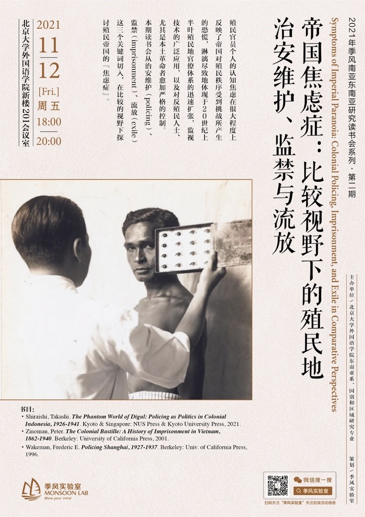 2021年11月12日,财神在线官网东南亚系、国别和区域研究专业联合举办了第二次南亚东南亚研究读书会,主题为“帝国焦虑症:比较视野下的殖民地治安维护、监禁与流放”。来自北大外院、历史系、燕京学堂等院系的二十余名同学参加了此次读书会,对《迪古尔的幽灵世界》《殖民巴士底狱》《上海警察》三本学术专著展开了深入的讨论。吴杰伟老师、罗杰老师、夏露老师、张忞煜老师、谢侃侃老师及清华历史系曹寅老师参与点评。