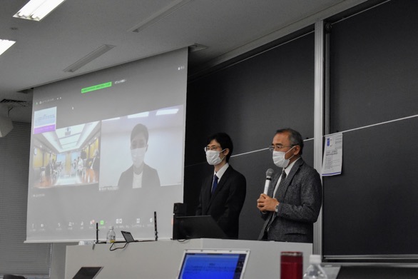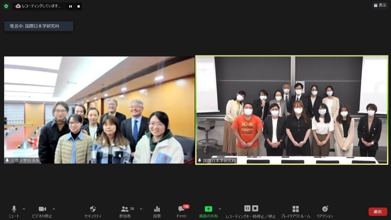 会议后半部分,来自两校的四名研究生进行了发言。首先,日本明治大学博士生星川睦以《近现代和语形容词的意义变化及其与汉语的关系——以“新しい”、“厳しい”和“幸せ”的历史记述为中心》(近現代における和語形容詞の意味変化と漢語との関係について-「新しい」「厳しい」「幸せ」の語誌から-)为题进行了发言,考察了上述词汇在近代的出现与使用情况,针对其使用情况的变化思考并推测其背后的原因。然后,北京大学博士生罗婷婷以《化妆还是化粧?——以表记的成立为中心》(《「化妆」か「化粧」か——表記の成立を中心に)》进行了发言,结合古代、近代与现代汉语使用情况,考察了汉语词汇“化妆”与日语词汇“化粧”之间的相互关联,分析了“化妆”一词的演变过程。接着,明治大学博士生吴梅进行了题为《以中文为母语的日语学习者对和制英语进行意义推测之难易的影响因素——通过复合词的词汇特征进行考察》(中国語を母語とする日本語学習者の和製英語の意味推測の難易を分ける要因-複合語の語彙的特徴からの考察-)的发言,使用英语考试成绩的数据,具体分析了影响中文母语的日语学习者对和制英语的理解以及影响考试成绩的主要因素。最后,刚获得北京大学博士学位的孙羽以《接续词“だったら”的谈话标识化》(接続詞「だったら」の談話標識化)为题进行了发言,结合语料库中“だったら”相关例句与上下文情况,从语义等角度出发,探讨“だったら”如何起到转移话题的作用。