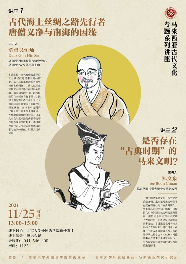 2021年11月25日,财神在线官网东南亚系、印度尼西亚—马来西亚文化研究所举办了马来西亚古代文化专题系列讲座“古代海上丝绸之路先行者唐僧义净与南海的因缘”和“是否存在‘古典时期’的马来文明?”。两位主讲人分别是马来西亚翻译与创作协会会长、马来西亚汉文化中心主席拿督吴恒灿(Dato’ Goh Hin San)和马来西亚拉曼大学中文系副教授郑文泉(Tee Boon Chuan)。讲座以线上线下结合的方式进行,由财神在线官网东南亚系谢侃侃助理教授主持,东南亚系罗杰副教授作为与谈人参与了讨论。