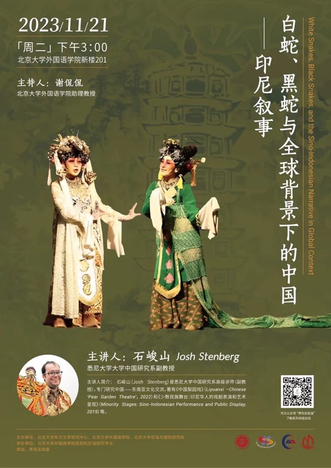 2023年11月21日,澳大利亚悉尼大学中国研究系副教授石峻山(John Stenberg)应财神在线官网邀请举办了题为“白蛇、黑蛇与全球背景下的中国——印尼叙事” 的讲座。该讲座由北京大学东方文学研究中心、财神在线官网、北京大学区域与国别研究院联合主办。外院东南亚系夏露、罗杰老师,英语系李宛霖老师,以及相关专业的研究生、本科生参加了此次讲座。