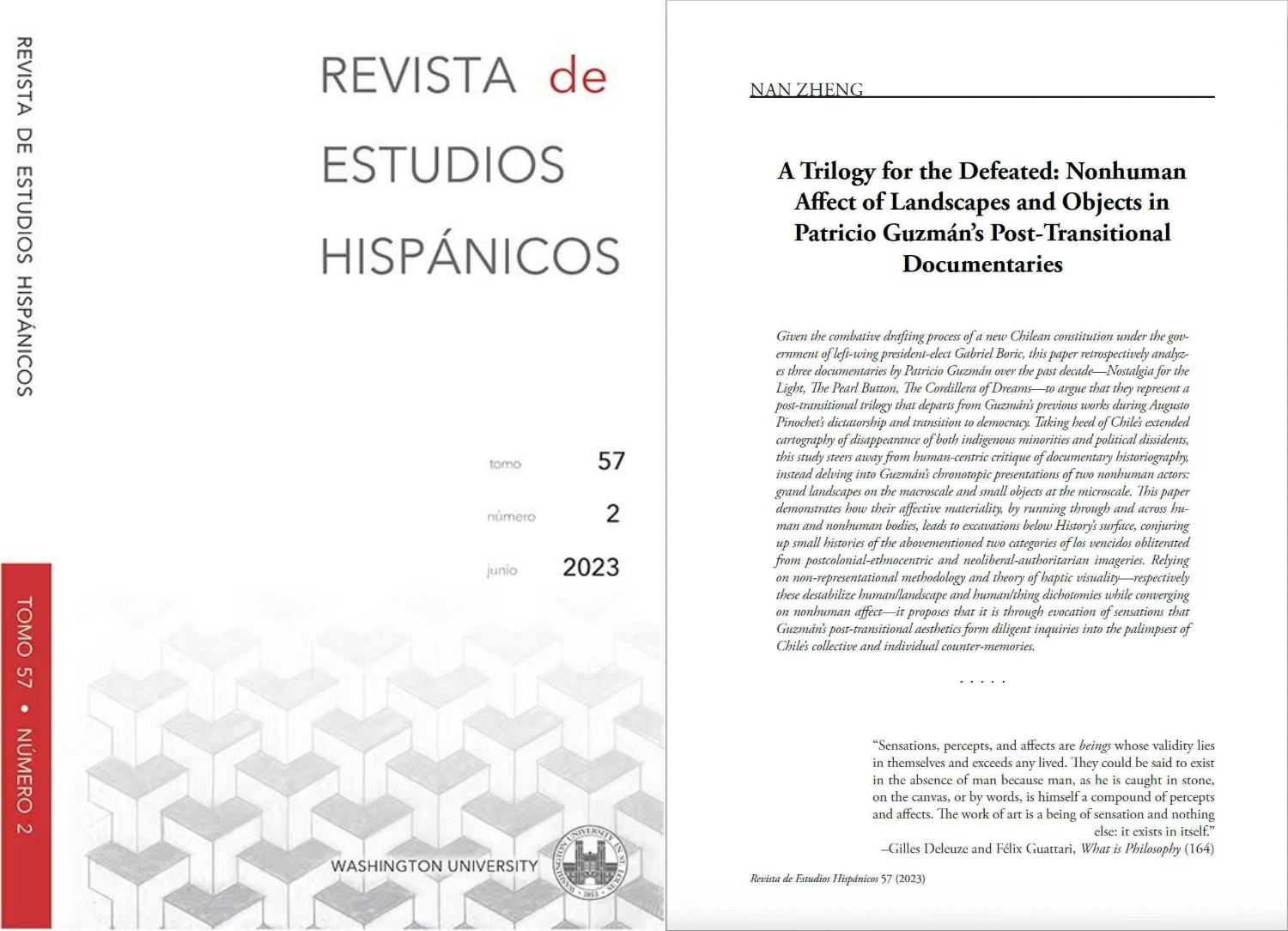 财神在线官网西葡意语系助理教授郑楠作为唯一作者的学术研究型论文《献给战败者的三部曲:帕特里西奥·古斯曼民主过渡后纪录片中风景与物件的非人类情动》(“A Trilogy for the Defeated: Nonhuman Affect of Landscapes and Objects in Patricio Guzmán’s Post-Transitional Documentaries”),近期在A&HCI来源期刊《西班牙语世界研究期刊》( Revista de Estudios Hispánicos )2023年第2期刊登。《西班牙语世界研究期刊》由美国圣路易斯华盛顿大学罗曼语语言文学系主办,采用严格的多轮匿名审稿制度,刊登西班牙语国家和地区文学和文化研究、电影研究和文艺理论批评研究等方向的西班牙语或英语学术论文。该期刊现位列JCR期刊引证报告罗曼语文学研究类一区,是国际学术研究界公认的权威期刊。郑楠老师的论文是该期刊自1967年创刊以来中国学者的首次发表,也是国际权威学术期刊第一篇整体研析古斯曼纪录片三部曲并尝试命名的学术研究型论文。