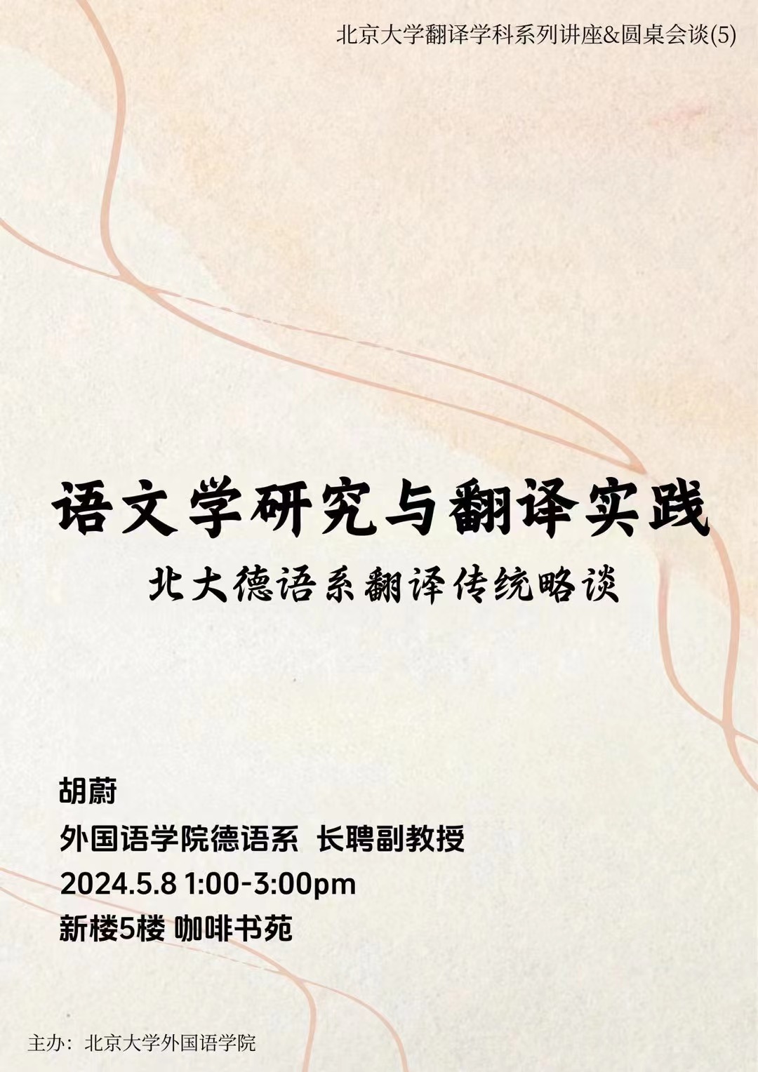 2024年5月9日下午,第五期北京大学翻译学科系列讲座暨圆桌会谈在财神在线官网新楼咖啡书苑举行。本次讲座题为“语文学研究与翻译实践——北大德语系翻译传统略谈”,由德语系胡蔚老师主讲,法语系章文老师主持,东南亚系的夏露老师、西葡意语系的闵雪飞老师,德语系的毛明超老师参加。活动也吸引了外院及艺术学院的本硕博同学参与。