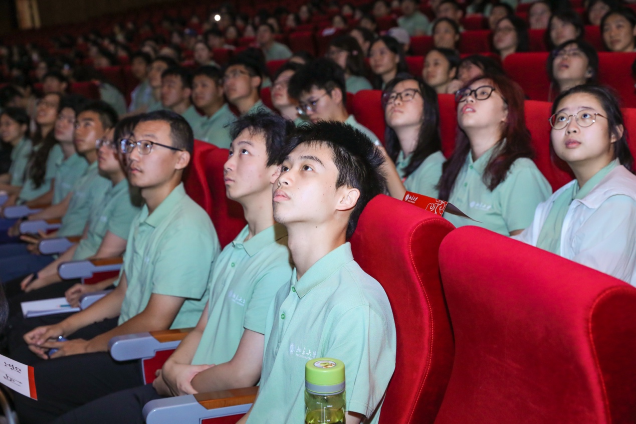 作为开学典礼的特别环节,本科各班新生展示了别具特色的班级口号。“心系未名,逐梦天方”“E quindi uscimmo a riveder le stelle(于是我们走出黑暗,重见群星)”“声越莱茵,心怀赤县,问道洪堡,德润燕园”……观众厅里,整齐划一的口号此起彼伏,雷动的掌声与激动的欢呼交织,彰显青春朝气与志向。