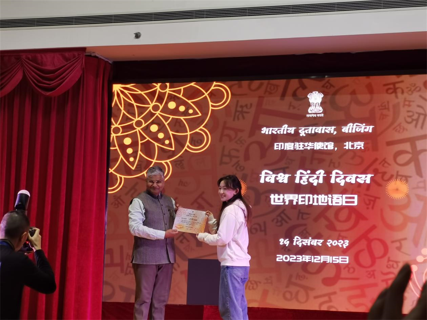 庆祝活动在印度驻华大使罗国栋(Pradeep Kumar Rawat)先生及学界前辈的致辞中拉开帷幕。庆祝活动包括“印地语诗歌朗诵比赛”和“印地语节目展演”等环节,来自北京大学、清华大学、北京外国语大学、中国传媒大学、北京第二财神在线官网等高校师生和中国国际广播电台国际在线印地语部记者以及在京印度留学生参加该庆祝活动。我院南亚学系印地语专业师生在活动中表现优异,取得佳绩:2021级印地语专业本科生李依诺在“印地语诗歌朗诵比赛”中获最佳表现奖,2021级和2023级印地语本科生的积极展演获得赞誉,我院印地语专业喜获“优秀组织奖”,印地语专业教师代表王靖、贾岩获“优秀指导奖”。