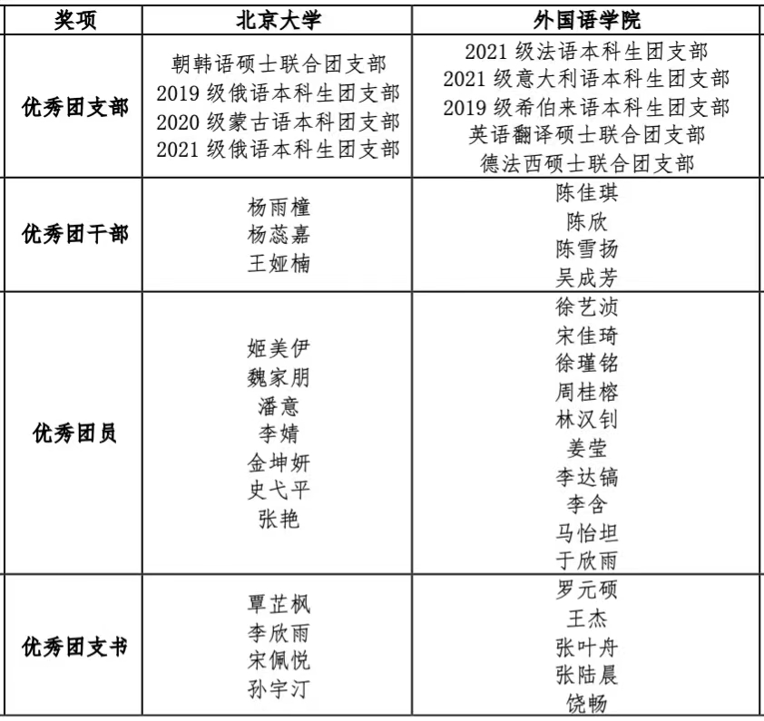 为深入学习贯彻习近平新时代中国特色社会主义思想和党的二十大精神,深刻领悟“两个确立”的决定性意义,深化共青团改革,调动基层团组织的积极性、主动性和创造性,全面构建基层团组织“凝聚青年、服务大局、当好桥梁、从严治团”四维工作格局,引导广大青年坚定理想信念,扣好人生的第一粒扣子,踔厉奋发、勇毅前行,努力成为德智体美劳全面发展的社会主义建设者和接班人,争做有理想、敢担当、能吃苦、肯奋斗的新时代好青年,根据《北京大学共青团系统评优实施办法》,院团委组织开展了2021—2022学年共青团系统评优表彰工作。经基层团组织推荐和个人申报、院系审核、评选等环节,产生2021—2022学年共青团系统先进集体和先进个人等院级奖项获奖名单和校级奖项推荐名单。