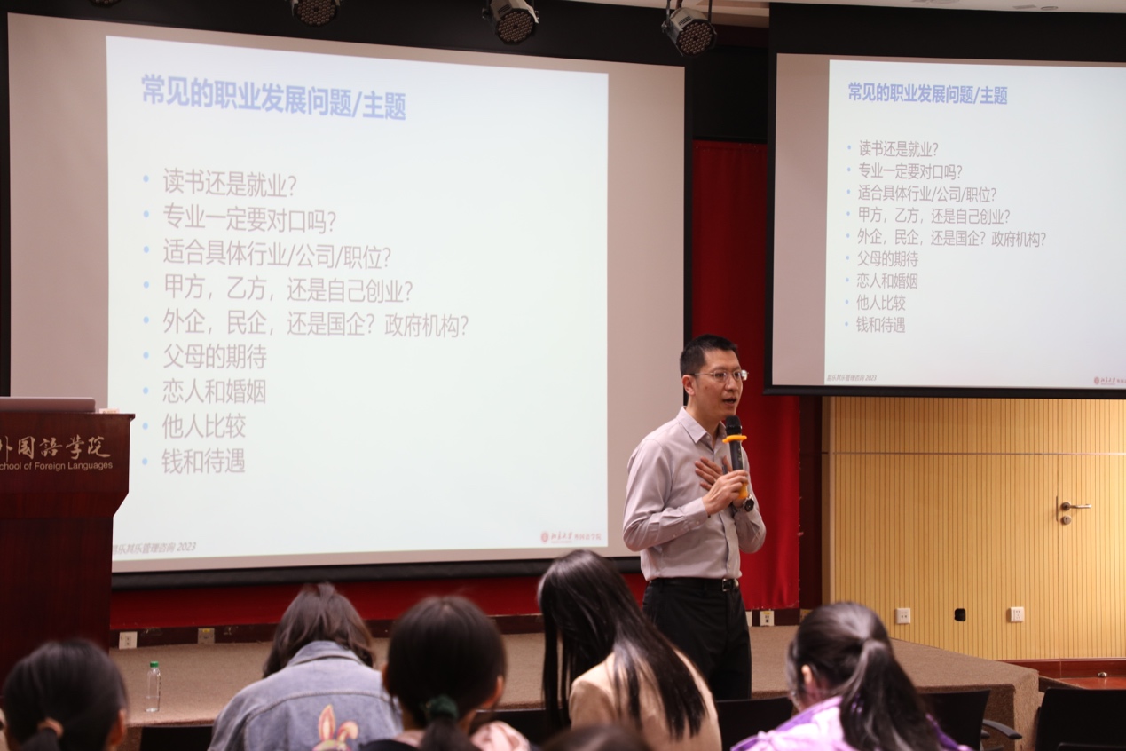 接下来,邹飞向大家介绍了IKIGAI理论,并具体从“擅长(GOOD)”“喜欢(LOVE)”“需要(NEED)”“付费(PAID)”四个维度解释了如何进行职业生涯规划。对四个维度的不同组合和排序也代表了不同的职业偏好。邹飞指出,在求职道路上要动态探索自我和环境,动态选择和调整四个维度的组合方式,并结合自己的职业发展经历,鼓励同学们从个人偏好出发规划自己的职业发展路径,找到自己感兴趣并相对契合的职业。