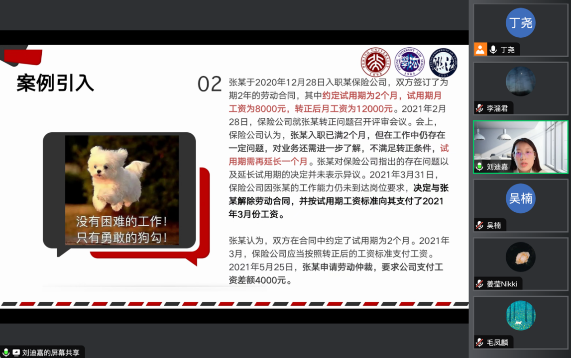 接下来,刘迪嘉围绕“试用期”展开讲解。她通过引入试用期薪资、试用期期限等方面的现实案例,帮助同学们对与试用期相关的法律陷阱形成具象认识,并分享了识别陷阱的方法和应对策略。此外,她介绍了“试用期”与“转正”的关系、与“实习”的区别等,帮助同学们厘清了诸多法律概念。