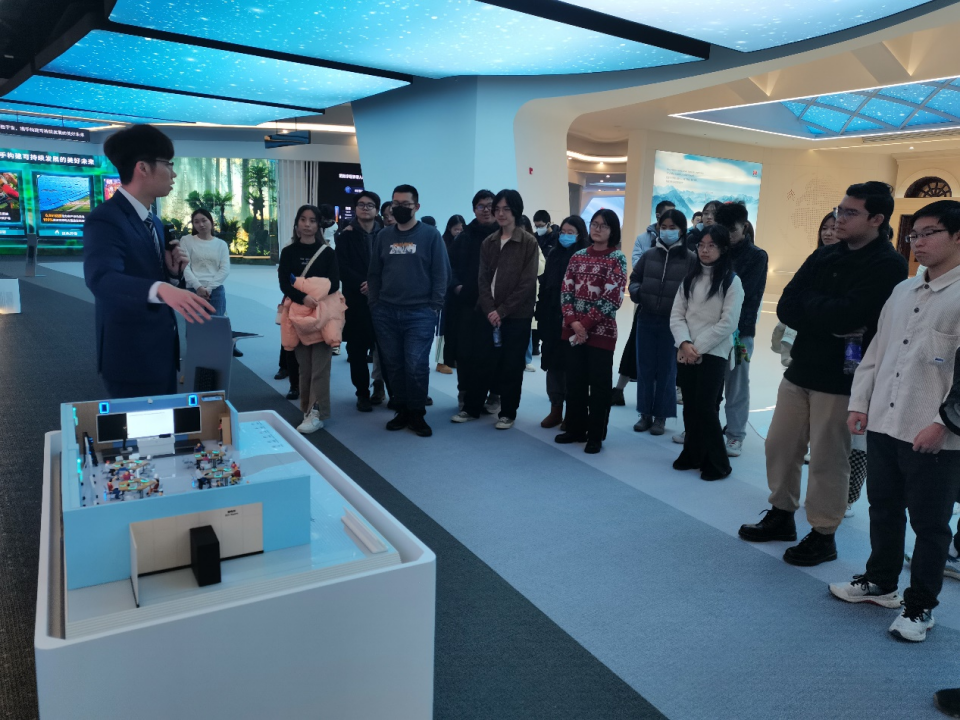 在展厅参观环节,讲解人员详细介绍了华为发展战略与核心价值观、业务部门、技术发展和经典案例等,帮助同学们深入了解华为在网络安全、生态保护、绿色发电、公益活动等方面的努力和成就,在智慧教育、智慧基建、智慧城市建设等方面的突破性成果,以及在AI、数字能源、自动驾驶等尖端技术领域的最新发展。