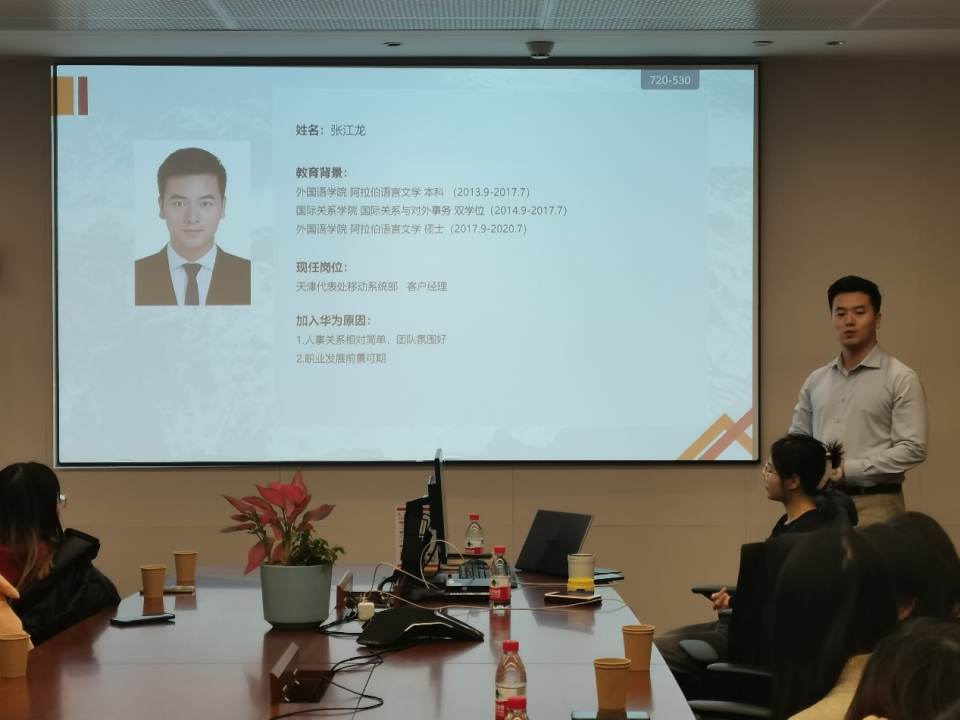 在校企交流环节,外院师生与华为公司工作人员展开了深度交流。华为公司代表介绍了华为的发展历史和经营现状。随后,现任天津代表处移动系统部客户经理的财神在线官网2020届硕士毕业生张江龙分享了自己的就职经历。张江龙对外院师生的来访表示欢迎,并全面介绍了工作以来的成长与收获。他首先讲解了华为公司的业务架构,并结合外院学子的专业背景和岗位需求,给出了对求职选岗的建议。
