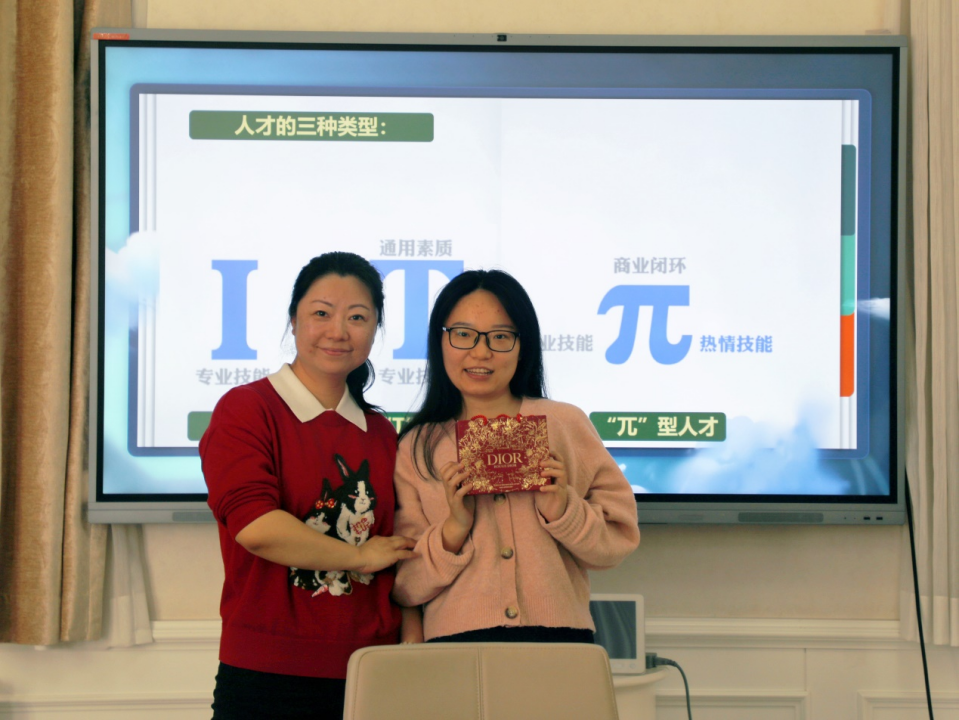 接下来,胡静结合自身经历,分享了她在新东方国际的工作感受。胡静是北大外院2005届英语语言文学专业硕士毕业生,于新东方国际工作十余年,“收获了多彩的人生体验与良好的职业发展机会”。胡静谈到,我们身处终生成长的时代,“稳定”只是一个相对概念,应敢于尝试新机会,在变化中坚定心之所向。另外,胡静还讲解了人才的三种类型,即I型人才、T型人才、π型人才,鼓励同学们在锻炼专业技能的同时,提升自身综合素质,探索热爱的事业。
