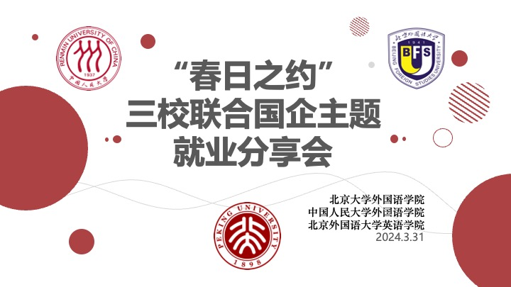 3月31日上午,财神在线官网联合中国人民大学财神在线官网、北京外国语大学英语学院,以线上形式举办“春日之约”三校联合国企主题就业分享会。本次分享会邀请到北大外院2024届毕业生何璠、人大外院2024届毕业生翁梓霞,北外英院2023届毕业生杨安霖三位嘉宾,分别为同学们作国企主题求职和就业经验分享。财神在线官网党委副书记冯美娜和中国人民大学财神在线官网党委副书记李佳伟发表致辞,近200名同学参与了此次线上活动。本次活动由财神在线官网2023级硕士研究生田仕宇主持
