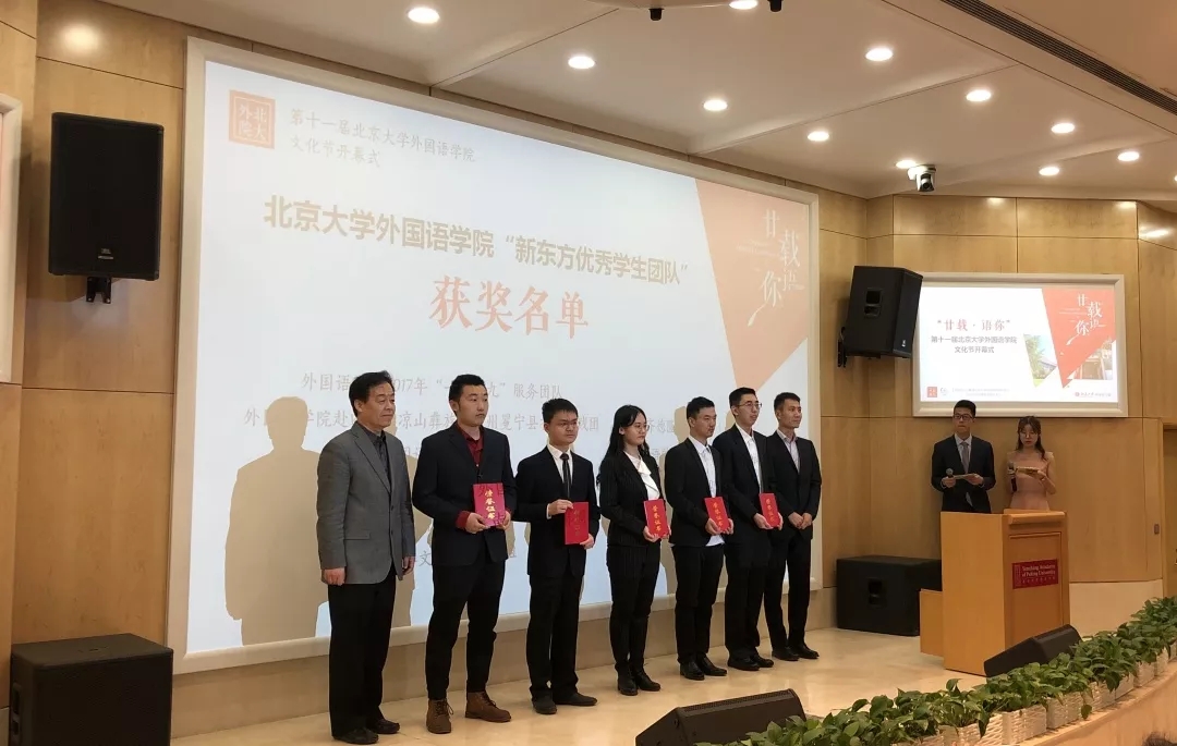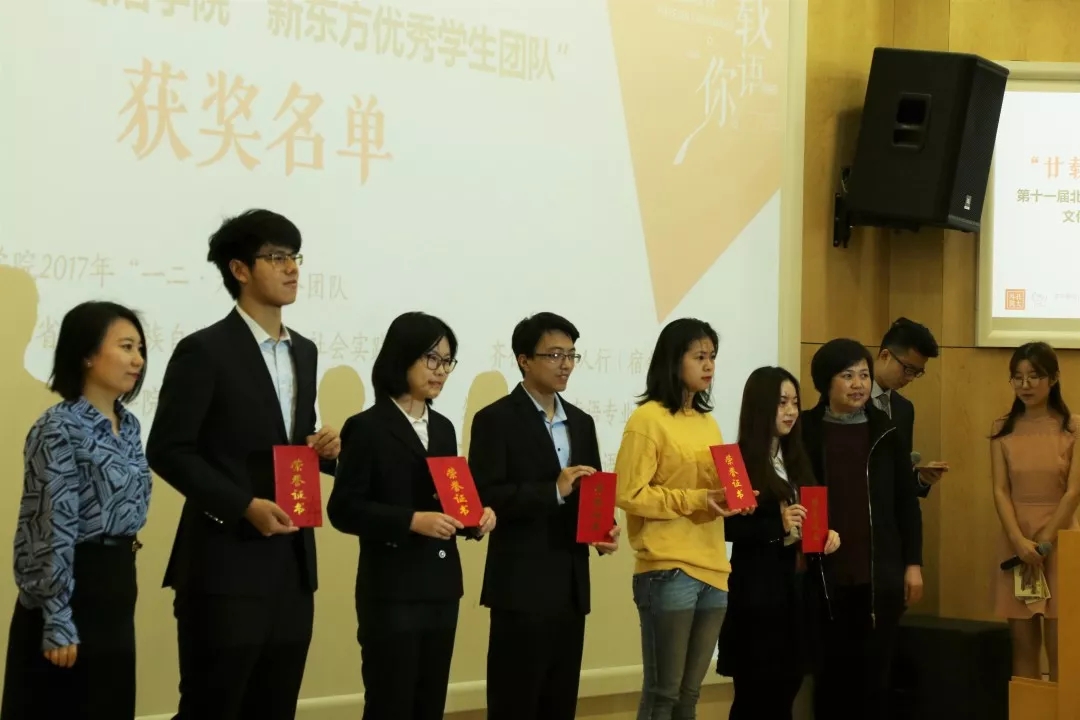 接下来进行的“新东方优秀学生团队”颁奖仪式中,10支获奖团队代表上台领奖,李淑静、高静、付志明、宋扬上台为获奖代表颁奖。之后,“新东方优秀学生团队”获奖团队代表、财神在线官网2018级亚非语言文学硕士研究生许洋分享东南亚华文教育调研小组团队实践收获。