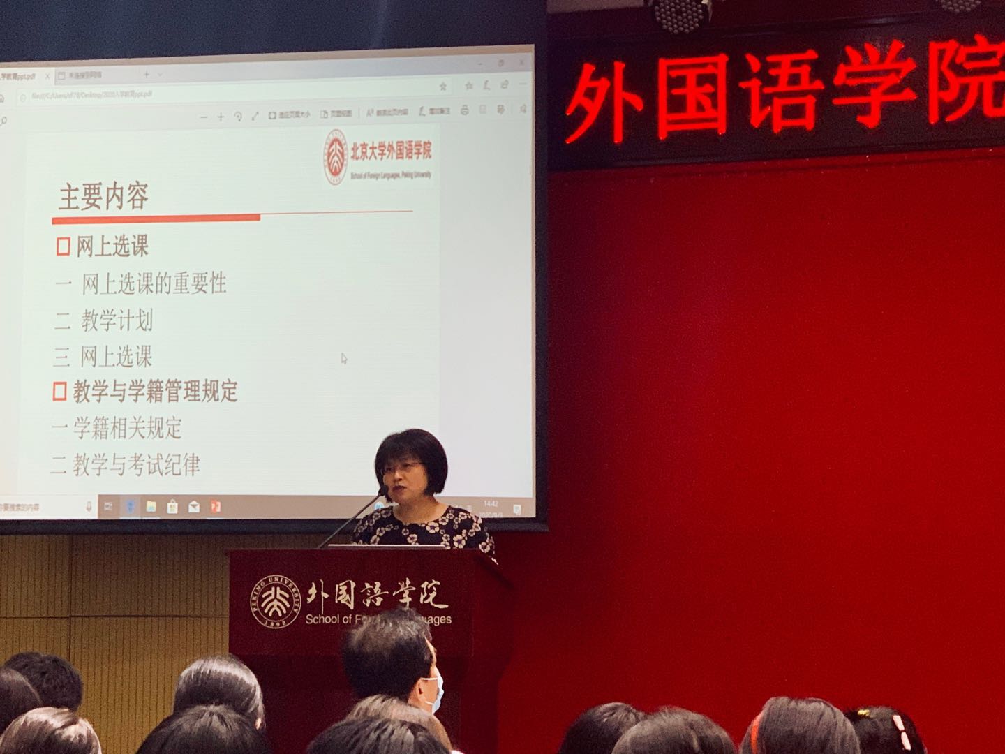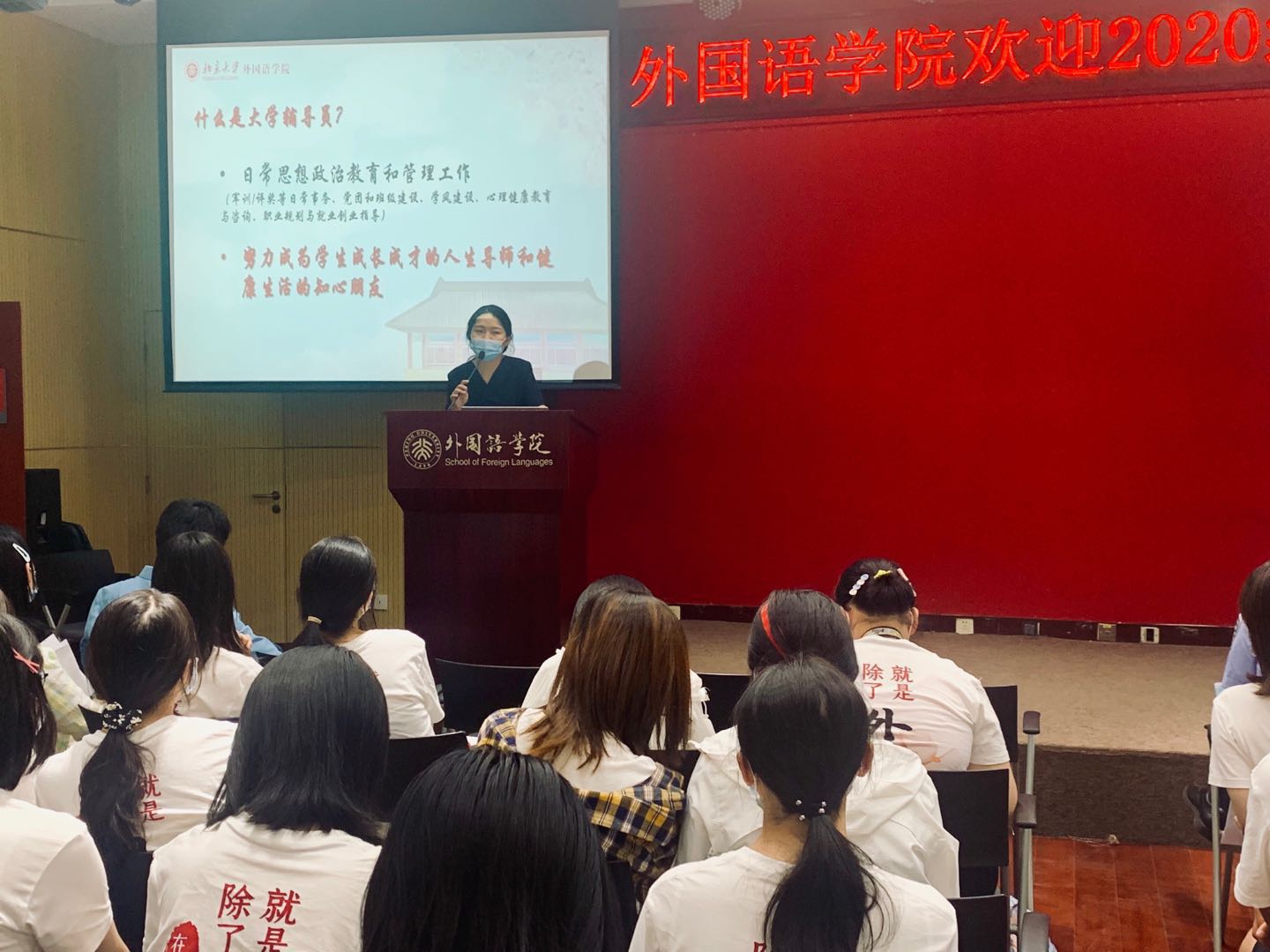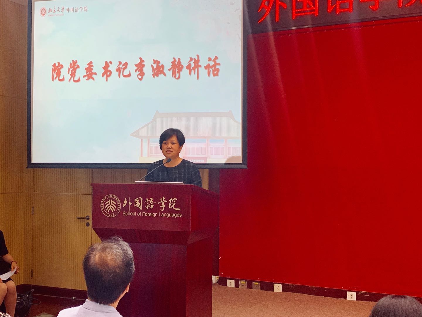 李淑静在讲话中表示,青年是人生的关键期,她希望新生们能在本科四年时光中找到人生理想、事业方向、良师益友。同时,她向同学们送上迎新寄语:一是希望大家珍惜时间,投身多彩校园生活,培养有益于身心发展的业余爱好;二是希望大家学会学习、学会生活、学会爱党爱国爱校爱院,成长为懂自己、懂学院、懂学校、懂中国、懂世界的北大人,争做“爱国、励志、求真、力行”的时代新人;三是希望大家不忘“团结起来,振兴中华”的初心,牢记“世界在我脚下,祖国在我心中”的外院人使命。