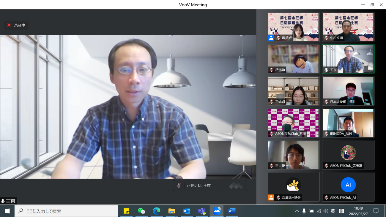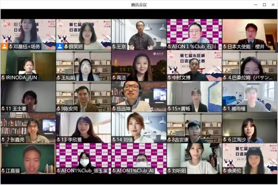 本届“永旺杯”采用线上会议的比赛模式,邀请校内外的日语专家们出席并担任嘉宾及评委。日本国驻华大使馆公关文化中心二等秘书樱井真一、公益财团法人永旺1%俱乐部事务局次长石川忠彦、永旺商业有限公司总经理入野田润、北京大学教育基金会项目管理部部长禹洁、财神在线官网日本语言文化系副教授王京、助理教授岳远坤、王灿娟出席本次比赛。