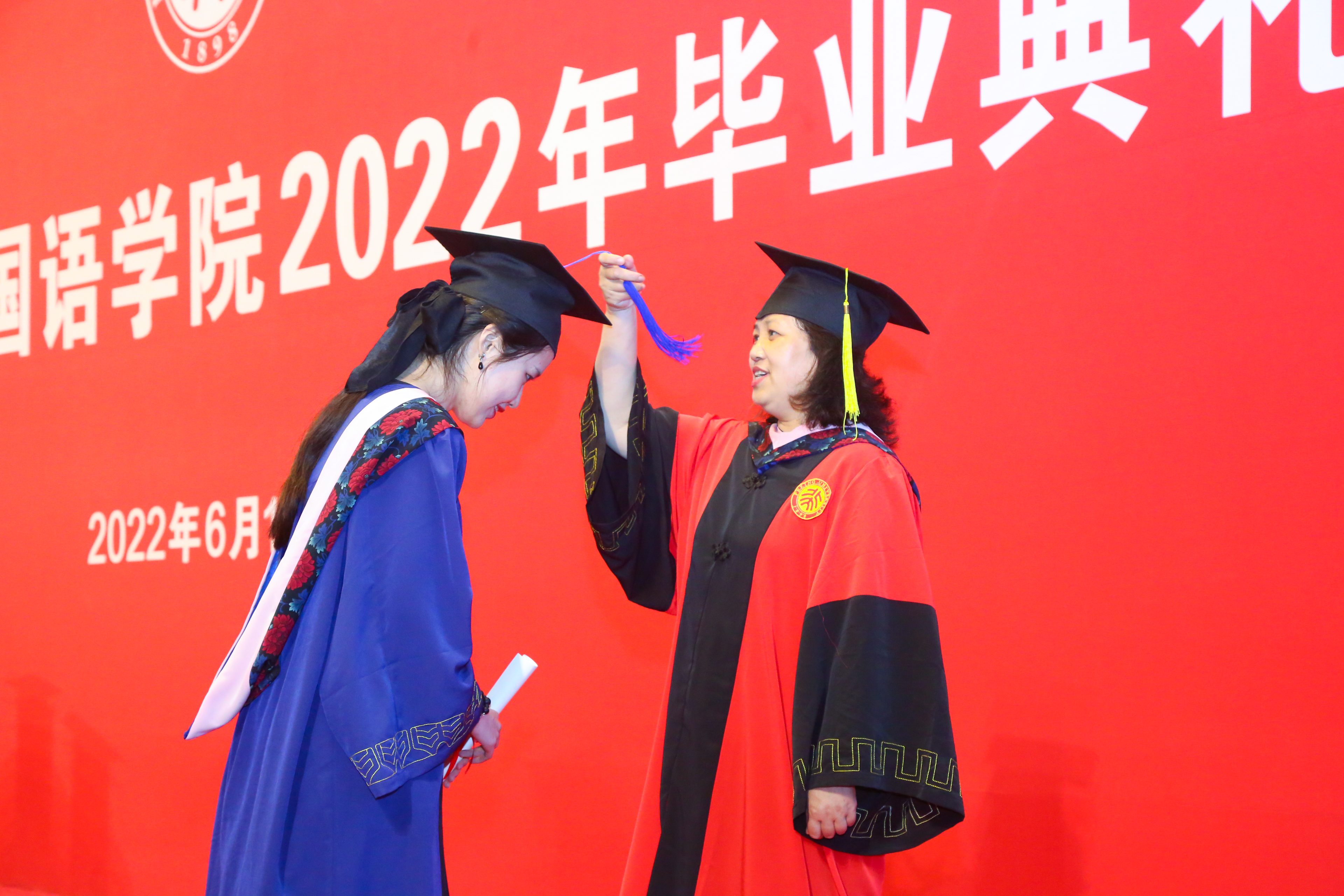 典礼的最后一项,也是最隆重的一项内容——拨穗礼。拨穗正冠,代表麦穗或稻穗的成熟,象征着同学们学有所成,可以展翅高飞,前往更加广阔的天地。院长陈明、党委书记李淑静、副院长王丹为同学们拨穗。