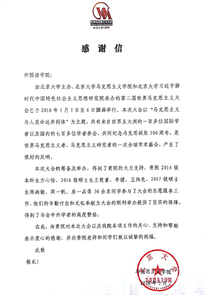 期间,财神在线官网师生高度重视并支持此次盛会,积极投身语言翻译及志愿者招募工作,获得主办单位高度评价。据统计,2014级本科生方心怡、2016级硕士生王楚童、李媛、王炜先、2017级硕士生陈尚敏、周一帆、房一品等30余名同学参与了大会的志愿服务工作,他们的辛勤付出和无私奉献为大会的顺利举办提供了坚实的保障,得到了与会中外学者的高度赞扬。马克思主义学院特发来感谢信,对他们的支持和帮助表示衷心的感谢。