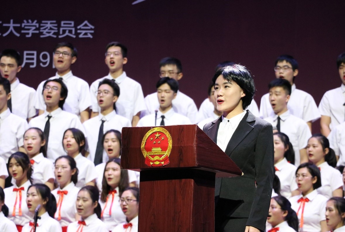 百年讲堂,大幕拉开,强队云集,座无虚席。十支学院代表队及离休教职工合唱团、校友爱乐合唱团、民主党派合唱团悉数登场,共同奉献了精彩纷呈的演出。外院代表队倾力呈现的《永远》,将整个“一二•九”师生歌会气氛推向高潮。大幕开启,指挥精准的手势和钢琴伴奏细腻的音符奏出一曲天籁;演唱之中,全体合唱团成员饱含深情、张力十足,和声处理张弛有度、拿捏细腻,呈现了一首超高水平的合唱曲目;舞台剧组生动地展现了从先驱们的筚路蓝缕到今日祖国繁荣华章中一代代前仆后继的外院人的使命与担当。落幕之时,“世界在我脚下,祖国在我心中”的响亮口号喊出了每个外院学子的心声。舞台上洋溢着的爱国之情、师生之谊、青春之华、艺术之美,征服了评委和观众。