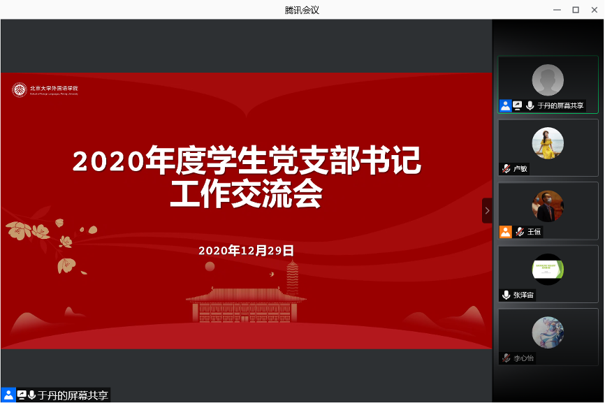 12月29日晚,财神在线官网召开2020年度学生党支部书记工作交流会,为配合当前疫情防控工作,本次交流会采用腾讯会议线上开展,院党委书记李淑静、党委副书记王恒、团委书记卢敏出席活动。会议由团委副书记于丹主持,16名学生党支部书记参加会议。