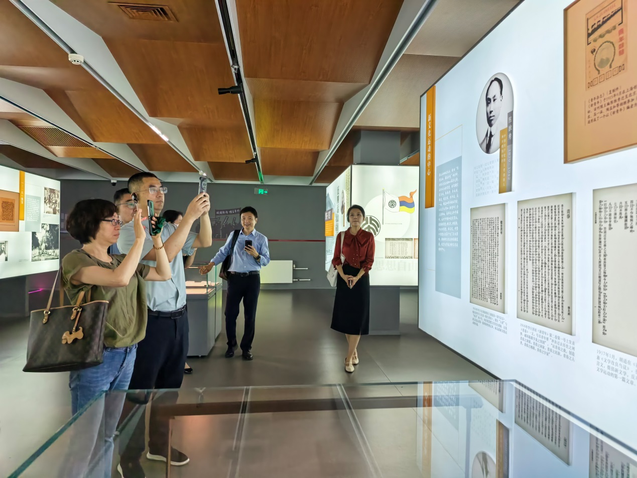 在参观北大校史馆过程中,双方人员跟随学生志愿者的专业讲解,通过展陈的珍贵历史文献与实物展品,系统回顾了北京大学作为新文化运动策源地、五四运动发祥地以及马克思主义早期传播重要阵地的光辉历程。在李大钊像前,全体肃立缅怀致敬革命先驱,深刻感悟革命先辈坚定的理想信念与崇高的精神风范。
