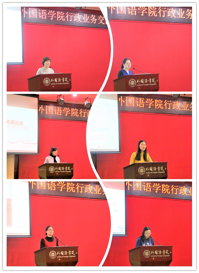 学院办公室总结了院庆系列活动取得成功的经验,以及对未来工作的启示。立足院庆活动,未来院办将在促进学院数据的搜集、整理、保存、应用,深入推进学院宣传工作,推动大型活动规范化等各方面发力,同时汇报了院办在安全管理、信息化管理、外事工作等方面的规范化建设情况。业务办公室以“细节传递温度”“规范提升管理”和“务实促进发展”为主题分别汇报了业务办的院庆服务、制度建设和2020年工作重点。教务办公室讲述了“教务与院庆的故事”,回顾了2019年在教学质量提升、教学制度改革、研究生培养管理方面的成果,提出了“教学管理制度化、育人过程体系化、工作流程协同化”的新年工作目标。学生工作办公室以“在20年的新起点上继续攀登”为题,汇报了院庆工作的台前幕后、学生工作主线和下一阶段工作设想。图书分馆分享了筹备院庆活动时的几个小故事和自身心得,总结了图书分馆秋季学期的工作并提出新年工作计划。最后,继续教育办公室从本科室工作出发,分享了继续教育工作、相关上级管理规定研读与工作计划。