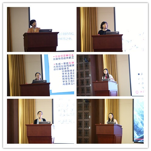 学院办公室结合自身工作,汇报了坚持立德树人根本任务,实现“三全育人”的各类举措:一是通过完善学院规章制度体系,明确工作流程规范,实现“管理育人”;二是通过为全院师生员工提供优质的服务保障,实现“服务育人”;三是通过构建良好的人文环境,增强团队凝聚力,实现“环境育人”。教务办公室以“加强管理、服务师生、助力育人全过程”为题,汇报了以“制度化管理为服务树立标杆,以精细化服务提升管理水平,在常态化疫情防控下练就管理技能”的新举措、新办法。业务办公室的汇报以“坚持立德树人,弘扬抗疫精神,优化治理服务”为主题,总结了在完善人事科研管理的制度建设、优化创新治理服务模式、助力学院一流学科建设等方面的工作成果。学生工作办公室重点汇报了建章立制、云战疫、以及抗疫期间提供暖心服务的案例和成功举措。图书分馆以“打造有温度的图书馆”为主题,汇报了制度建设、疫情期间特色服务等相关情况。继续教育办公室则重点汇报了疫情防控工作,以及落实网络教学方案,推动项目平稳完成的宝贵经验。