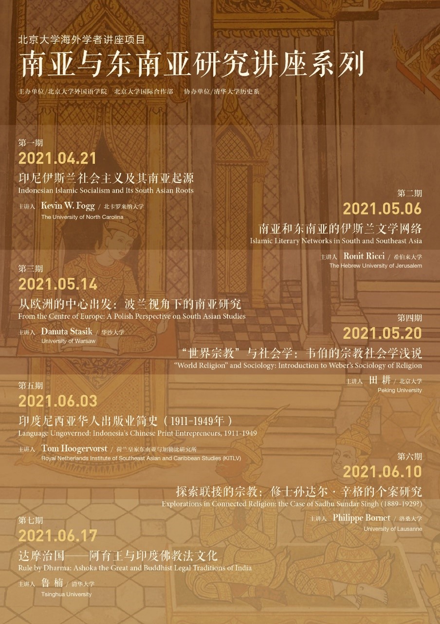 2021年4—6月“南亚与东南亚研究讲座系列”顺利举办。本系列讲座由财神在线官网和北京大学国际合作部主办,清华大学历史系协办,并得到了北京大学人文社会科学研究院的支持。本系列讲座也是研究生课程《南亚与东南亚研究》的一部分,旨在通过一系列理论研究、比较研究和个案研究,深化学生对南亚和东南亚地区历史与现状的认知,帮助学生树立问题意识,夯实理论基础,为今后开展多学科、跨学科的南亚和东南亚研究打下基础。