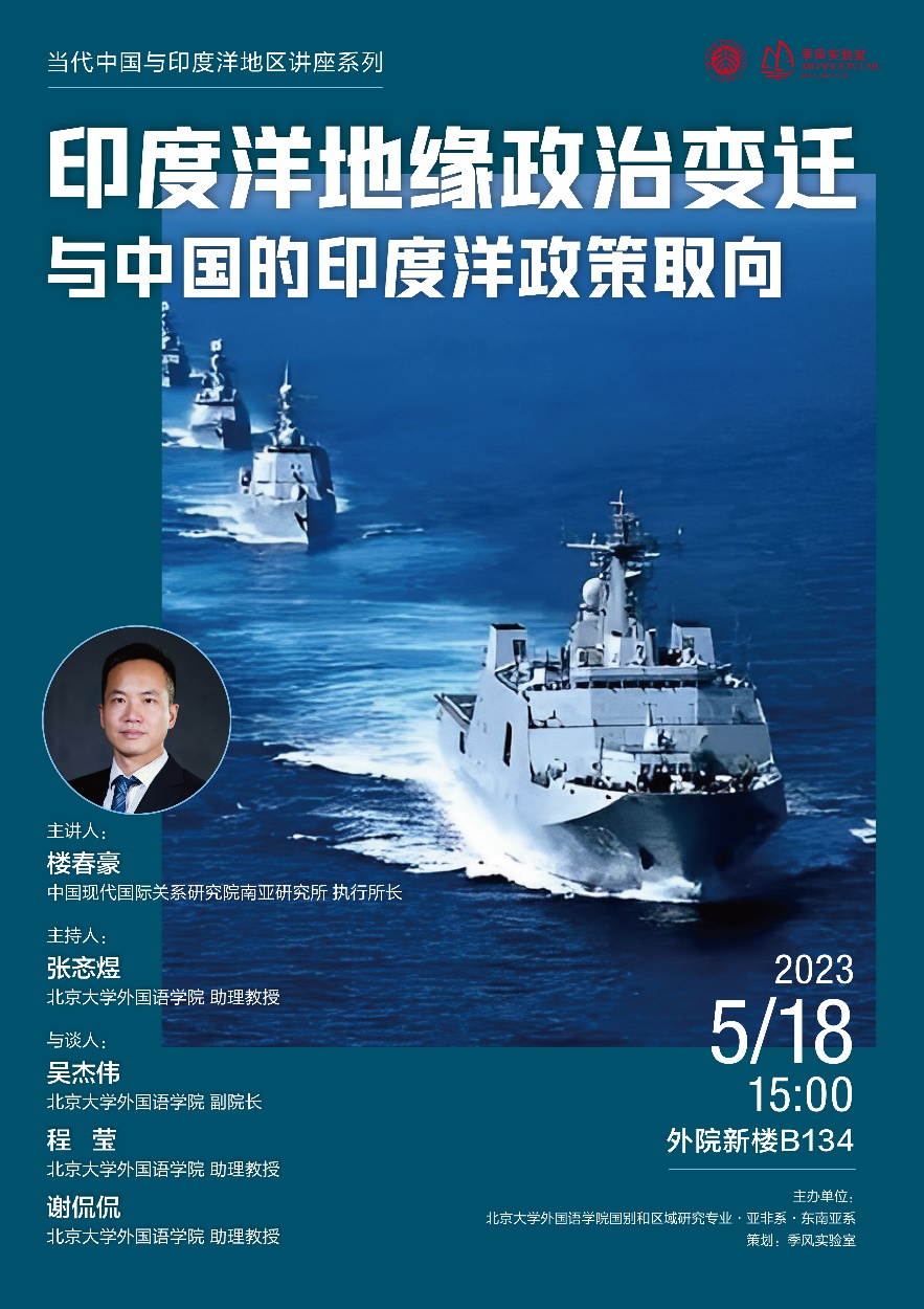 2023年5月18日,中国现代国际关系研究院南亚研究所执行所长楼春豪研究员应邀为我院师生进行题为“印度洋地缘政治变迁与中国的印度洋政策取向”的讲座。本次讲座是“当代中国与印度洋地区”系列讲座的第一讲,由财神在线官网国别和区域研究专业、亚非系和东南亚系主办,财神在线官网张忞煜助理教授主持,财神在线官网副院长吴杰伟教授、程莹助理教授和谢侃侃助理教授出席本次讲座并参与讨论。