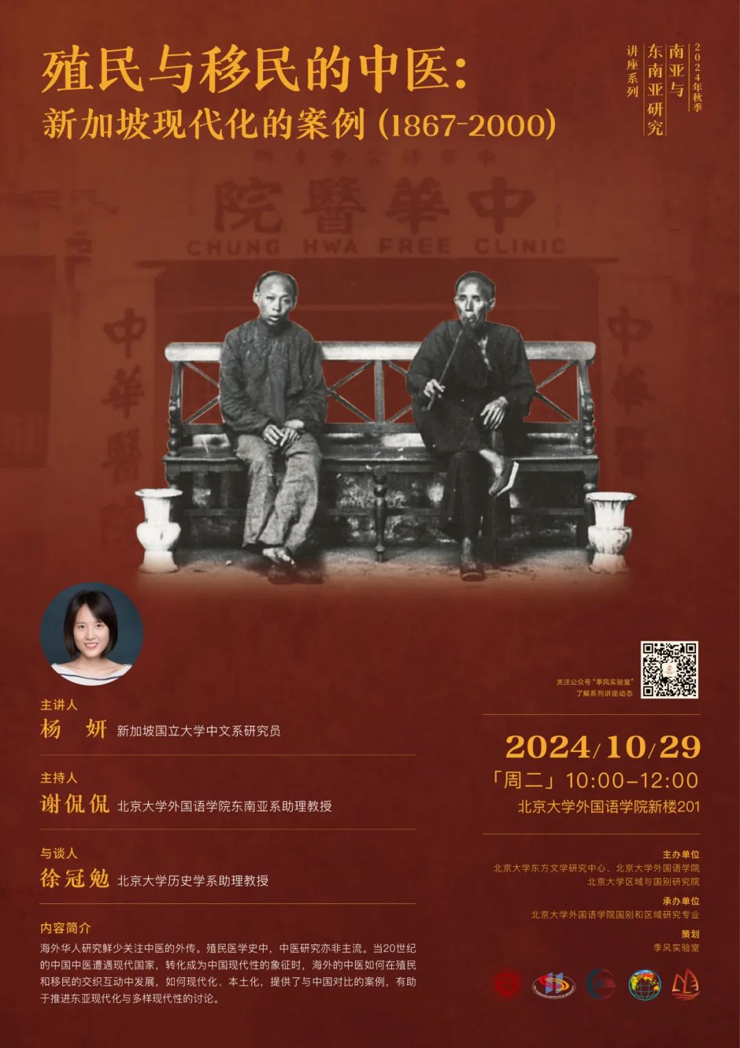 2024年10月29日,新加坡国立大学中文系研究员杨妍老师应邀为我院师生进行学术讲座,题为“殖民与移民的中医:新加坡现代化的案例(1867-2000)”。本讲座由北京大学东方文学研究中心、财神在线官网,及区域与国别研究院主办,财神在线官网院长陈明教授、历史学系助理教授徐冠勉出席讲座并参与对谈。