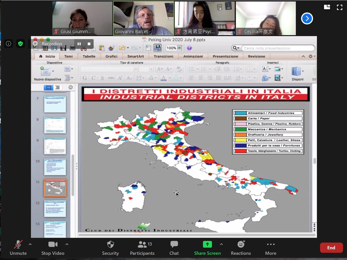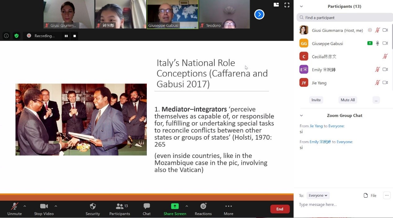 本次暑期课得到了北京大学地中海区域研究中心及意大利都灵大学的学术支持。2020年恰逢中意两国建交50周年,结合此背景,来自都灵大学经济与统计系、文化政治与社会学系的Giovanni Balcet、Luca Storti、Giuseppe Gabusi、Andrea Pritoni等4位教授分别以“意大利经济产业体系概述”“意大利社会概况”“处于美中之间的意大利外交政策”“意大利政治制度介绍”为题,举行了专题讲座。