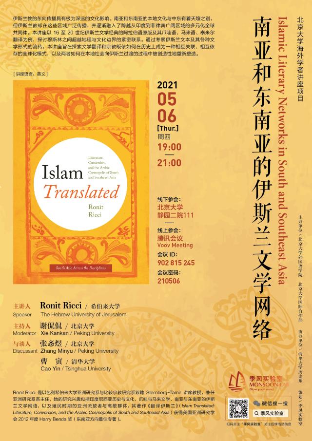 2021年5月6日,财神在线官网在国际合作部“海外学者讲座项目”的支持下举办了“南亚和东南亚的伊斯兰文学网络”的主题讲座。主讲人Ronit Ricci是以色列希伯来大学亚洲研究系与比较宗教研究系Sternberg-Tamir双聘讲席教授,兼任亚洲研究系系主任,主要研究方向为印度尼西亚历史与文化、爪哇与马来文学、南亚与东南亚伊斯兰文学网络,以及殖民时期的亚洲流放者与离散群体。讲座由东南亚系助理教授谢侃侃主持,国别和区域研究专业助理教授张忞煜、清华大学历史系副教授曹寅作为与谈人参与了讨论。