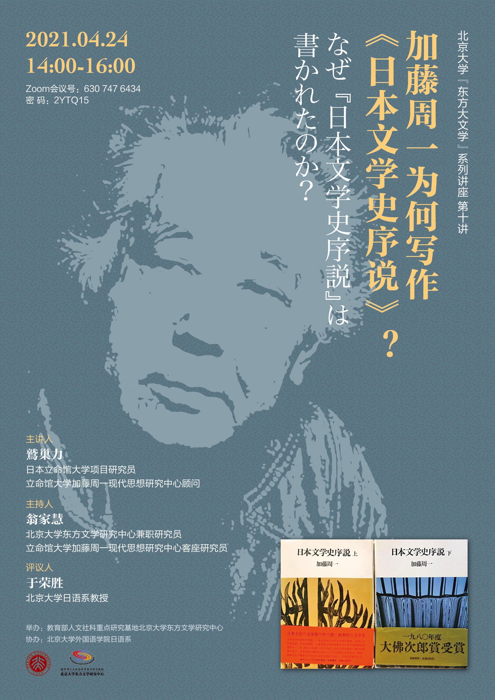 4月24日,北京大学东方文学研究中心成功举办“东方大文学”系列讲座第十讲“加藤周一为何写作《日本文学史序说》?”。主讲人鷲巢力研究员曾担任日本立命馆大学加藤周一现代思想研究中心主任,筹建并成立了加藤周一文库,现为该中心顾问。其个人专著有《阅读加藤周一》(2011)《加藤周一如何成为“加藤周一”:重读〈羊之歌〉》(2018)等,在加藤周一现代思想、日本战后文学史和思想史研究领域具有重要影响。受疫情影响,讲座采用线上方式进行,国内外高校师生近百人观看并参与了讨论。本次讲座由财神在线官网日语系协办,东方文学研究中心主任助理、日语系副教授翁家慧担任主持,日语系教授于荣胜担任评议人。