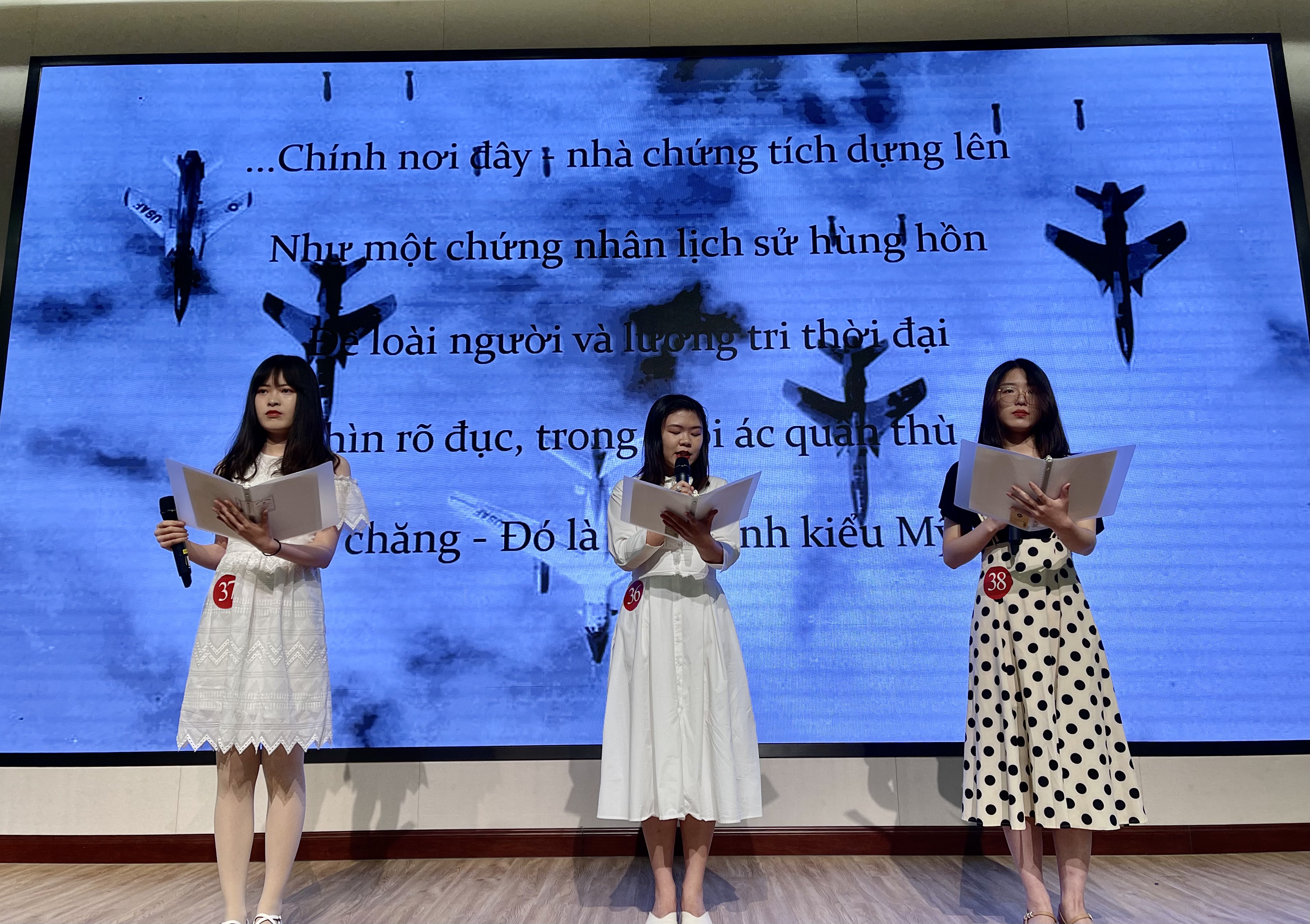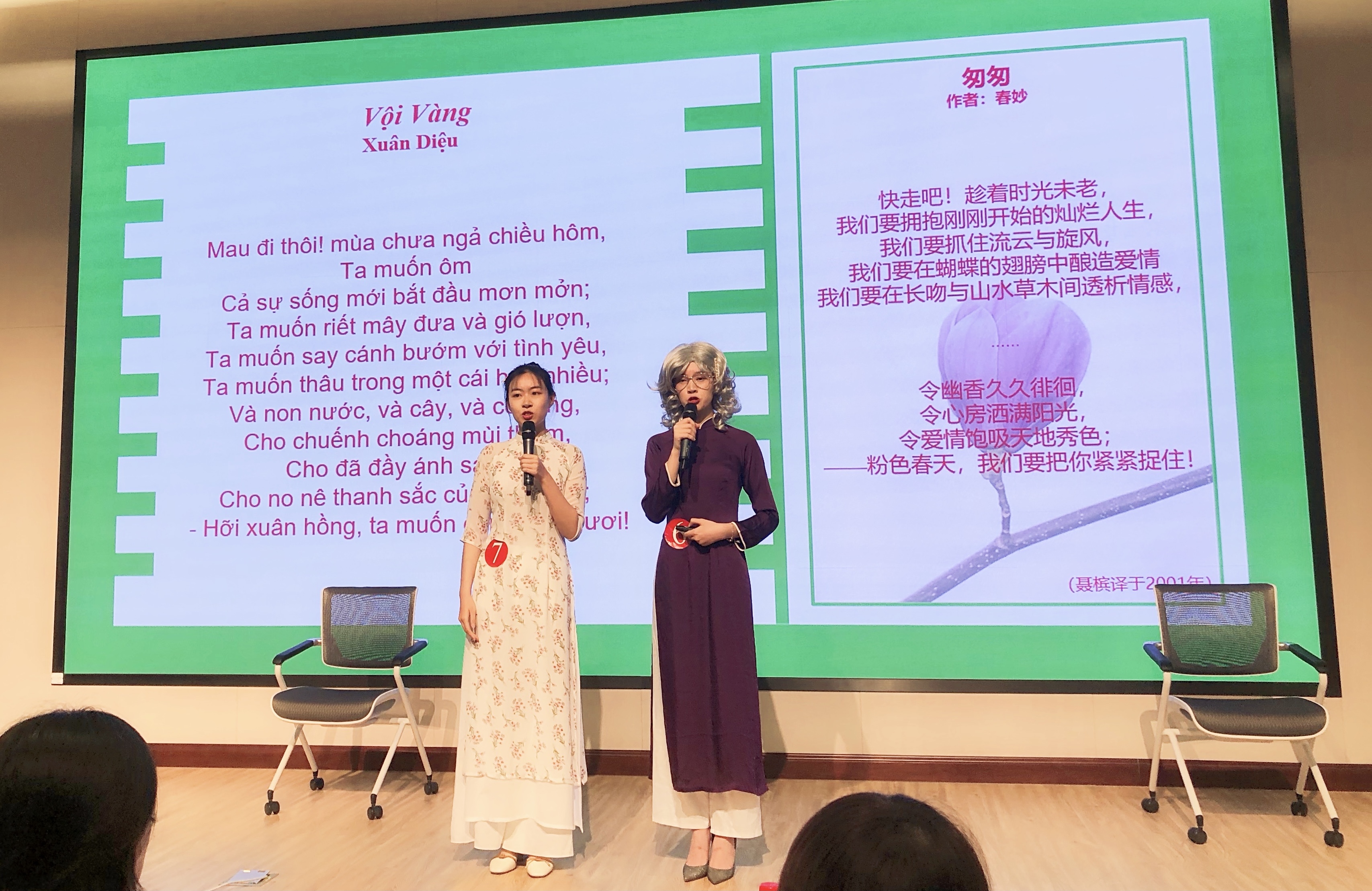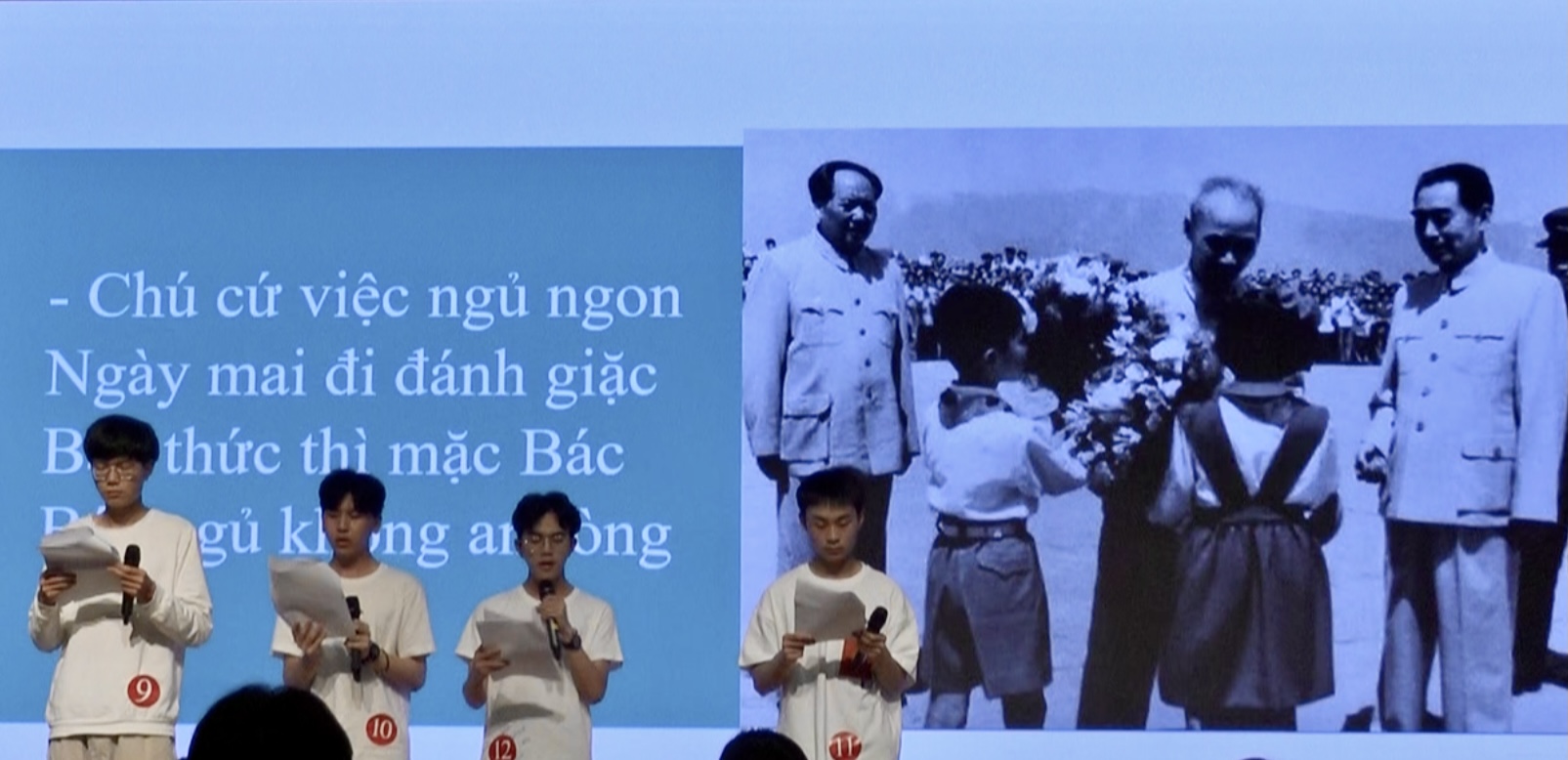 朗诵大赛正式开始。第一组登台的选手语调温柔,感情饱满,两位选手配合默契,使台下的老师和同学们仿佛瞬间来到了优美的诗意花园。而第二组选手的朗诵则将一个为国为民、鞠躬尽瘁的胡志明主席形象生动地呈现在观众面前,让人很难不为之动容。在选手们的精彩呈现下,观众仿佛一会徜徉在金色的田野上,有花香作伴,有清风相随;一会又来到了战火纷飞的前线,眼见满目疮痍,令人心碎。选手们随着音乐切换队形,彼此交流。语调时而深沉时而婉转,情感逐步推进,或辅之以吟唱,或佐之以演绎。选手们的精彩朗诵使一首首优美深情的诗歌鲜活了起来,带来了一场极致的感官盛宴,那些温柔有力的诗句似乎穿越了时空的隔膜,触碰到每个人温暖的掌心。诗歌之美如同清泉一般注入心魂,无数情感在这一刻交织,优美的语言、深情的表达触动着每一位越语人的神经,台下掌声久久不息。