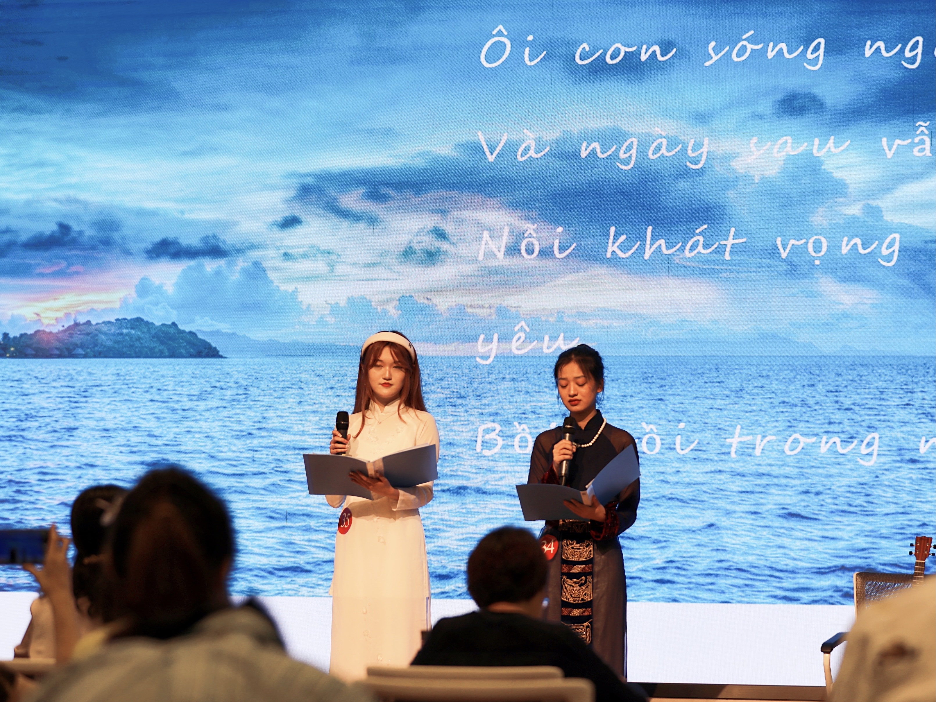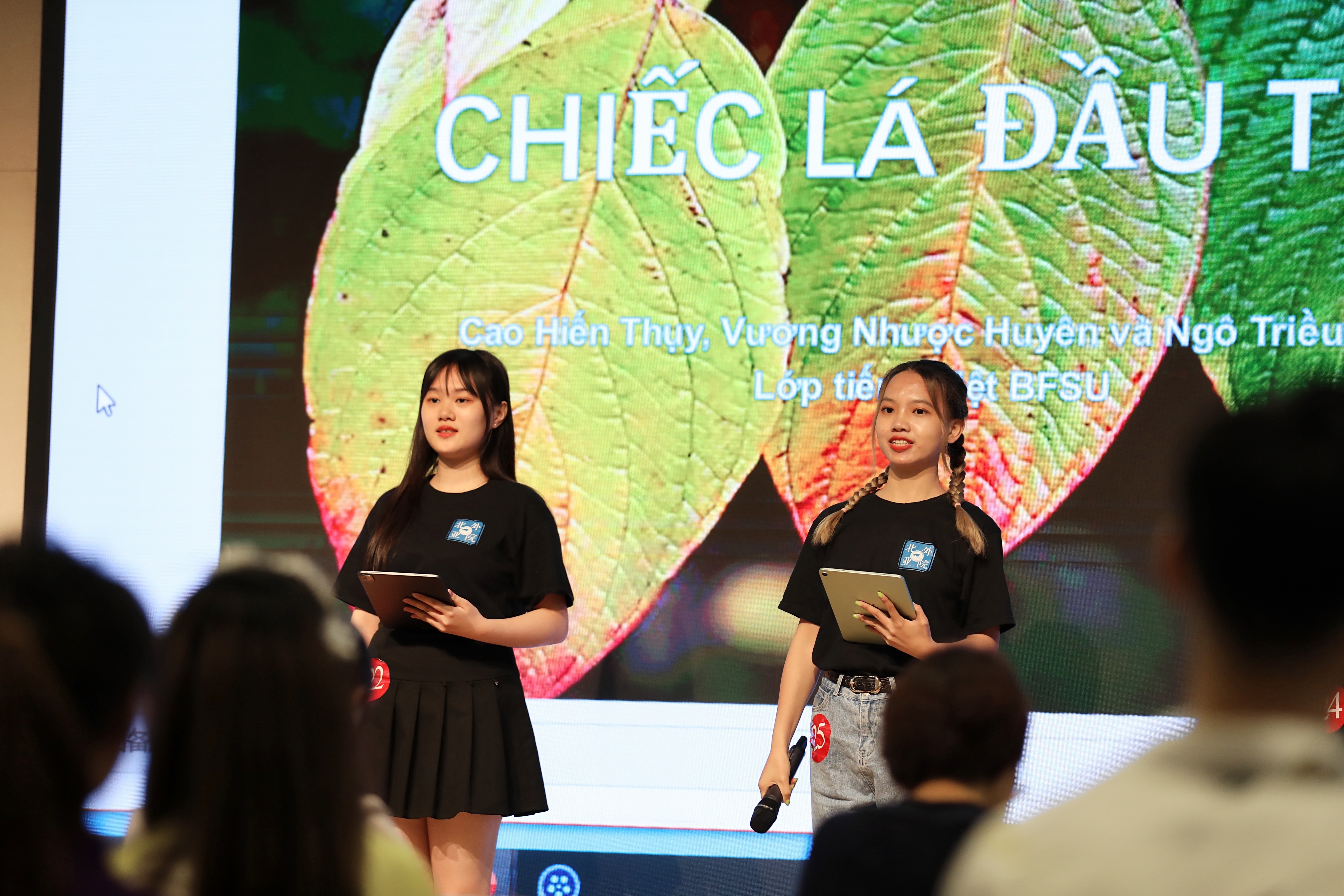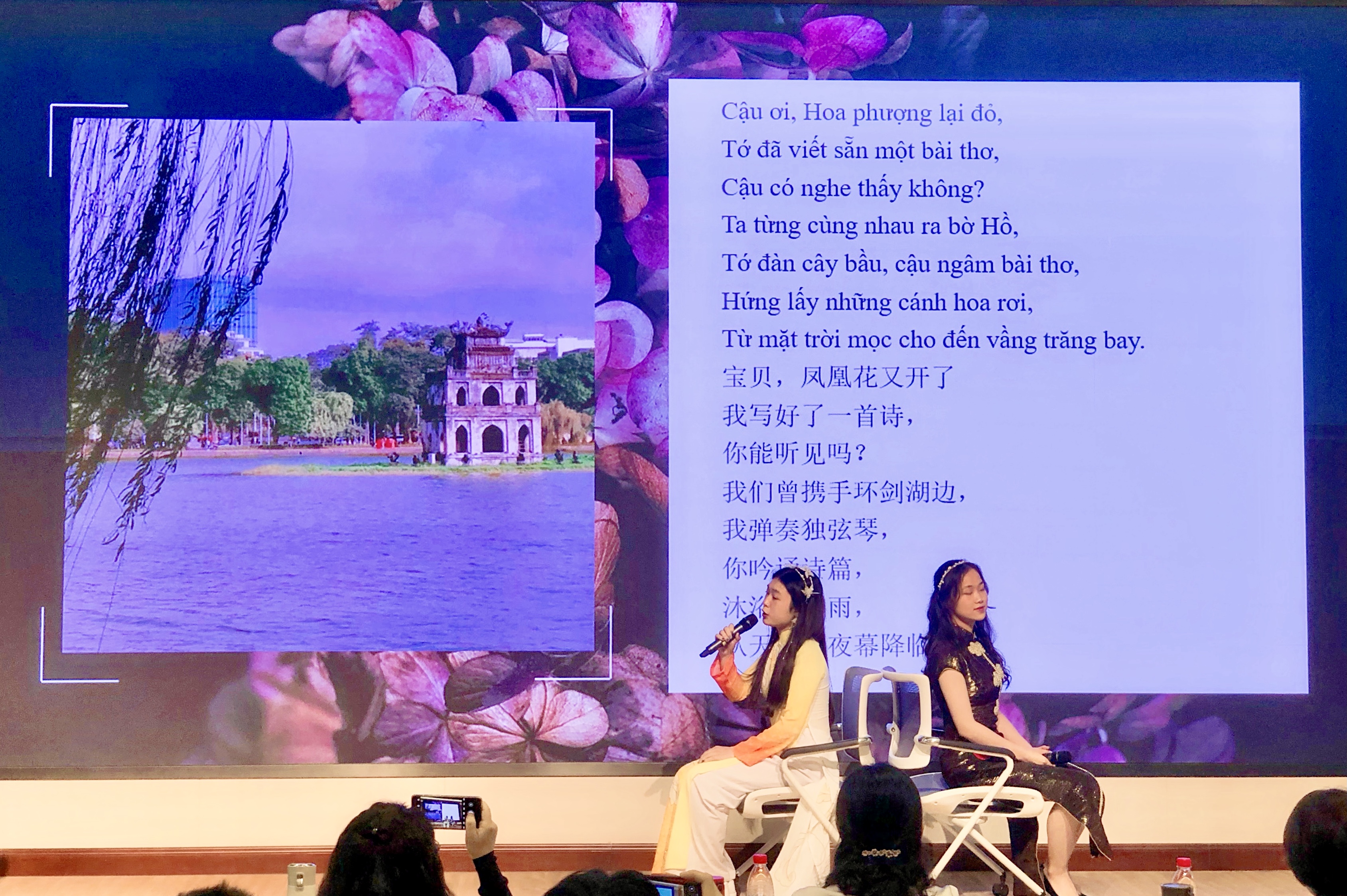 朗诵大赛正式开始。第一组登台的选手语调温柔,感情饱满,两位选手配合默契,使台下的老师和同学们仿佛瞬间来到了优美的诗意花园。而第二组选手的朗诵则将一个为国为民、鞠躬尽瘁的胡志明主席形象生动地呈现在观众面前,让人很难不为之动容。在选手们的精彩呈现下,观众仿佛一会徜徉在金色的田野上,有花香作伴,有清风相随;一会又来到了战火纷飞的前线,眼见满目疮痍,令人心碎。选手们随着音乐切换队形,彼此交流。语调时而深沉时而婉转,情感逐步推进,或辅之以吟唱,或佐之以演绎。选手们的精彩朗诵使一首首优美深情的诗歌鲜活了起来,带来了一场极致的感官盛宴,那些温柔有力的诗句似乎穿越了时空的隔膜,触碰到每个人温暖的掌心。诗歌之美如同清泉一般注入心魂,无数情感在这一刻交织,优美的语言、深情的表达触动着每一位越语人的神经,台下掌声久久不息。