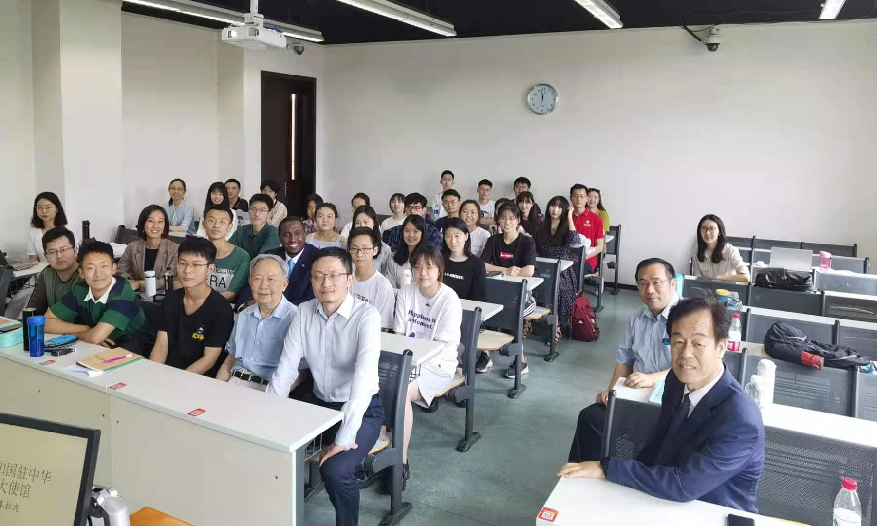 大使先生说:外交工作充满了乐趣,但也充满了挑战。我鼓励在座的学生努力学习并成为一名外交官。因为这将激励大家探索外面的世界,增进互相了解,并对全球挑战有深入的认知。我不仅代表着索马里这一个国家,同时我也代表着整个非洲,我们与中国有许多共同目标。不管你们未来从事什么职业,都会成为未来的领导者。你们很幸运生长在一个文化深厚的国家,我希望你们可以保持团结并尊重不同的文化,将来你们一定可以改变世界。