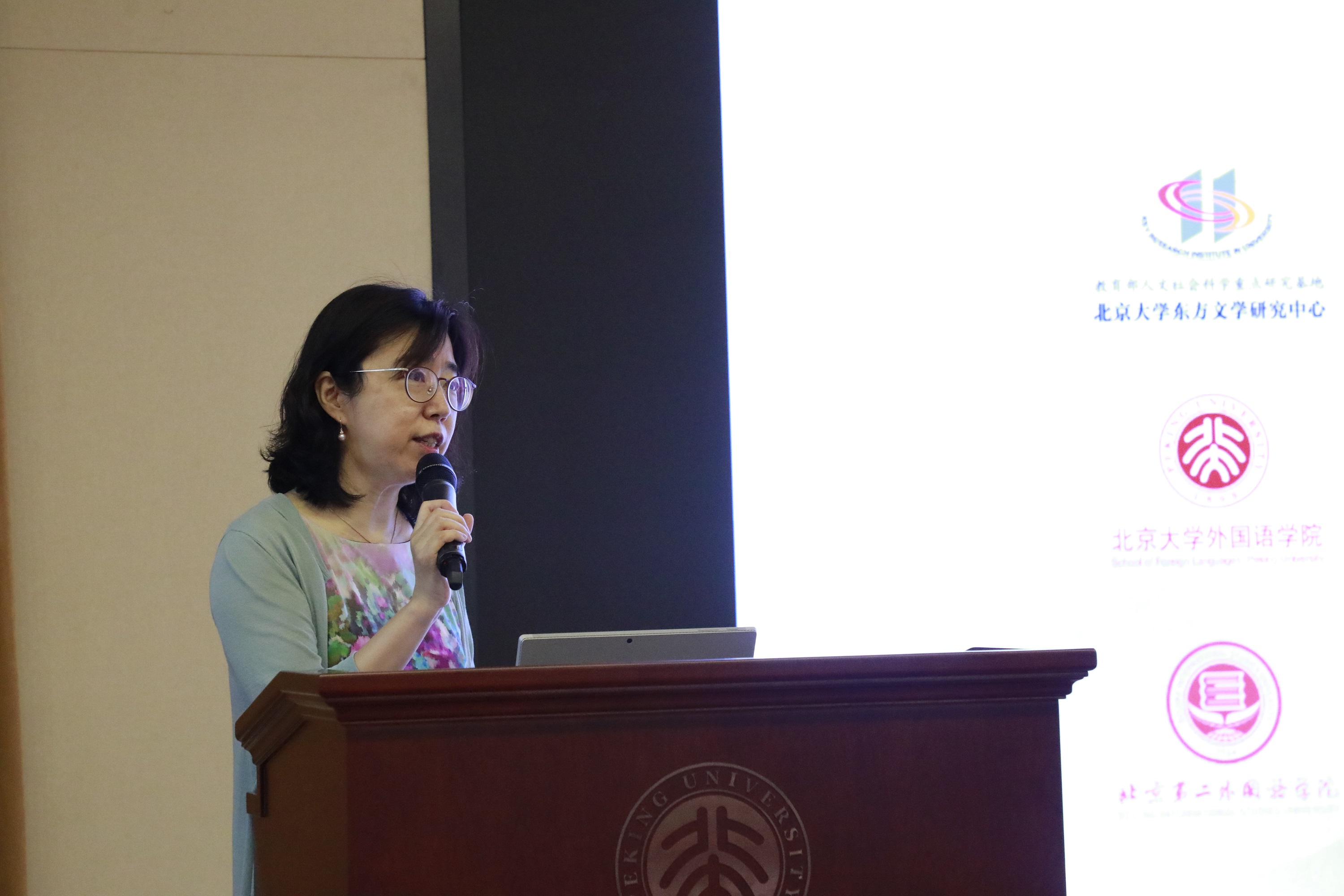 北京大学研究生院培养办主任胡晓阳老师发表了开幕致辞。致辞中,她对本次暑期学校的开办表示衷心的祝贺,也对中心多年来培养人才、提升研究生学术素养、提升北京大学研究生教育影响力方面做出的努力表示了肯定。自2009年“研究生创新计划”启动以来,北京大学研究生院共支持了200余期诸如此类的暑期学校,始终致力于为研究生提供全方位的成长环境,大力支持在传统学习模式的基础上搭建一个“跨学科、跨领域”的新平台。本次暑校选题“人类命运共同体视野下的东方文学”在契合当下时事的同时,不仅具有创新意识,还符合东方文学学科特点。对东方文学研究领域的同学们来说,这是一次难得的学习机会,对各兄弟院校来说,也是一次互相沟通和加强联系的机遇。她希望这个有传统、有特色、有深度的学术品牌项目能够愈加壮大、百尺竿头;也希望学员们在这次学习过程中,借助多学科语境,找到新问题、学会新方法、建立学术联系、收获学术友谊。北京大学研究生院也将在此期间发挥好育人功能和学术导向的作用,形成更多具有北大特色、反应学术前沿、服务国家需求的品牌项目。