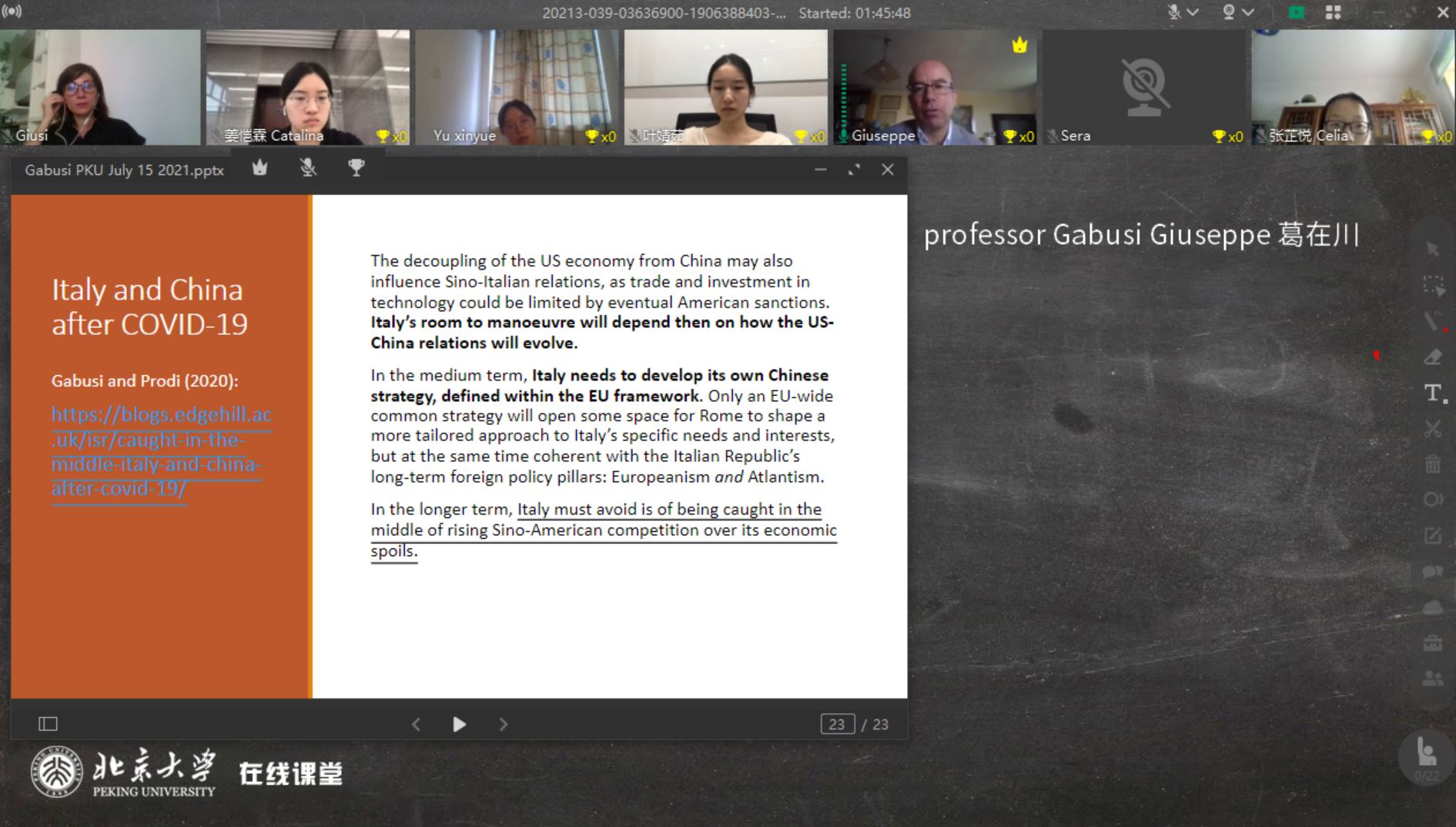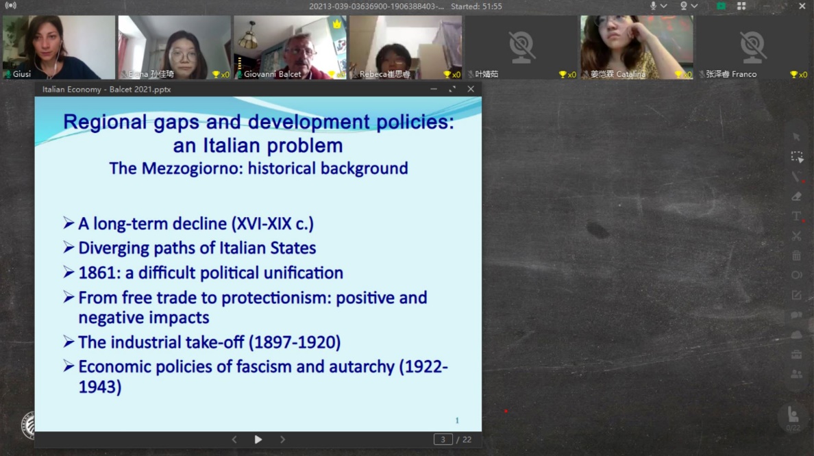 本次暑期课得到了北京大学地中海区域研究中心及意大利都灵大学的学术支持。来自都灵大学经济与统计系、文化政治与社会学系的Giovanni Balcet、Luca Storti、Giuseppe Gabusi、Andrea Pritoni等4位教授分别以“全球视野中的意大利经济”、“意大利社会:新旧谜题”、“意大利外交政策”、“意大利政治制度介绍”为题,举行了专题研讨。