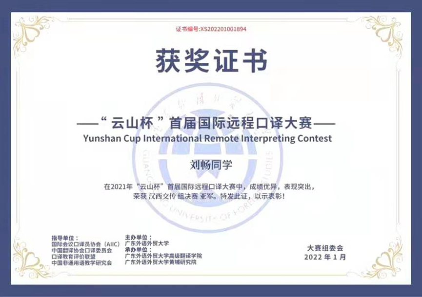 北京大学西班牙语专业注重学生人文素质和综合能力的培养,倡导学生“一专多精”,鼓励学生在钻研专业课程之余积极选修其他学科课程,支持学生参加各类学科竞赛,提高知识水平,锻炼专业能力,提升跨学科知识应用能力和跨文化行为能力。 刚刚过去的2022年1月,西班牙语专业18级本科生刘畅同学荣获了广东外语外贸大学主办的“云山杯”首届国际口译远程大赛汉西交传组决赛亚军。