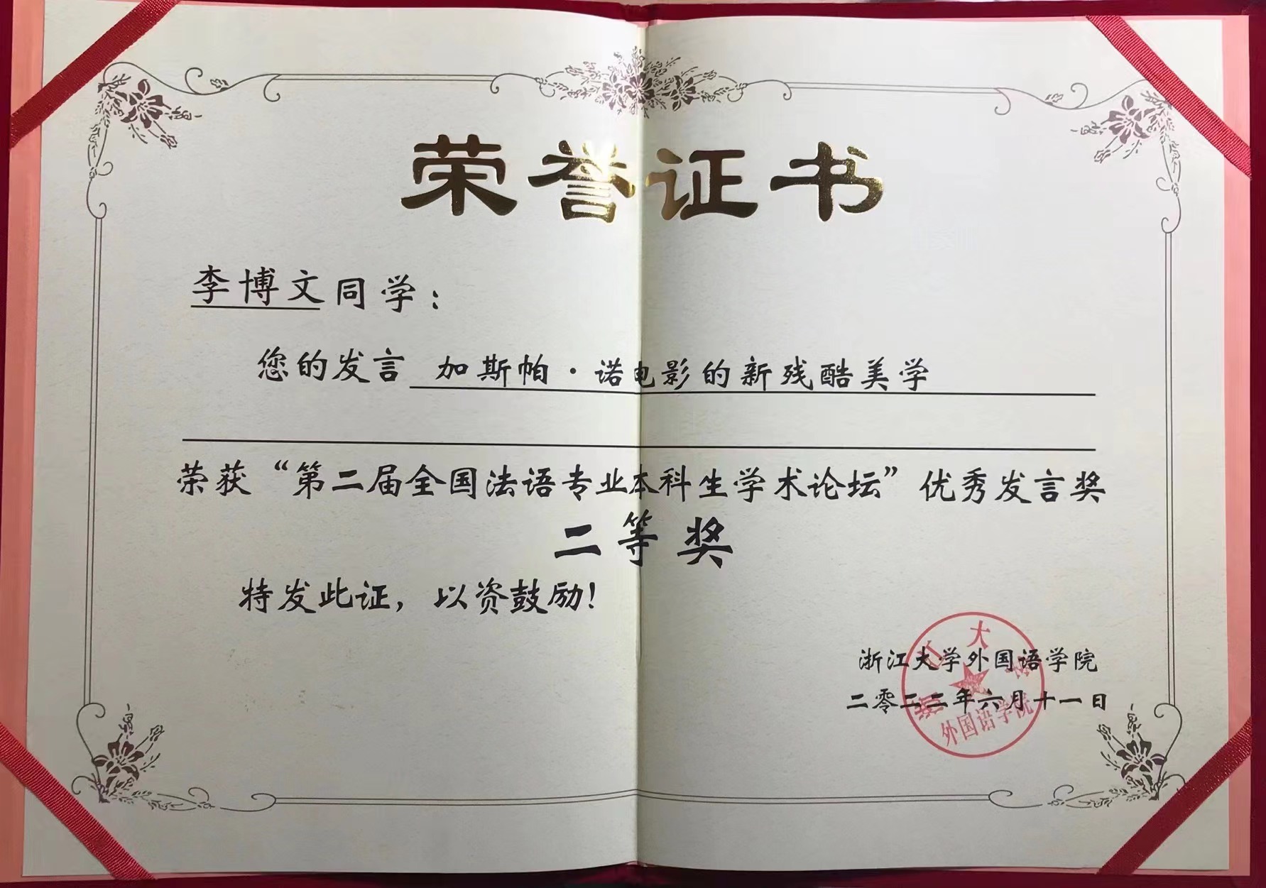 2022年6月11日,由浙江大学外语学院法语语言文化研究所联合上海外语教育出版社组织的第二届“全国高校法语专业本科生学术论坛”在线上举办。我院法语系2019级本科生同学李博文获得二等奖。
