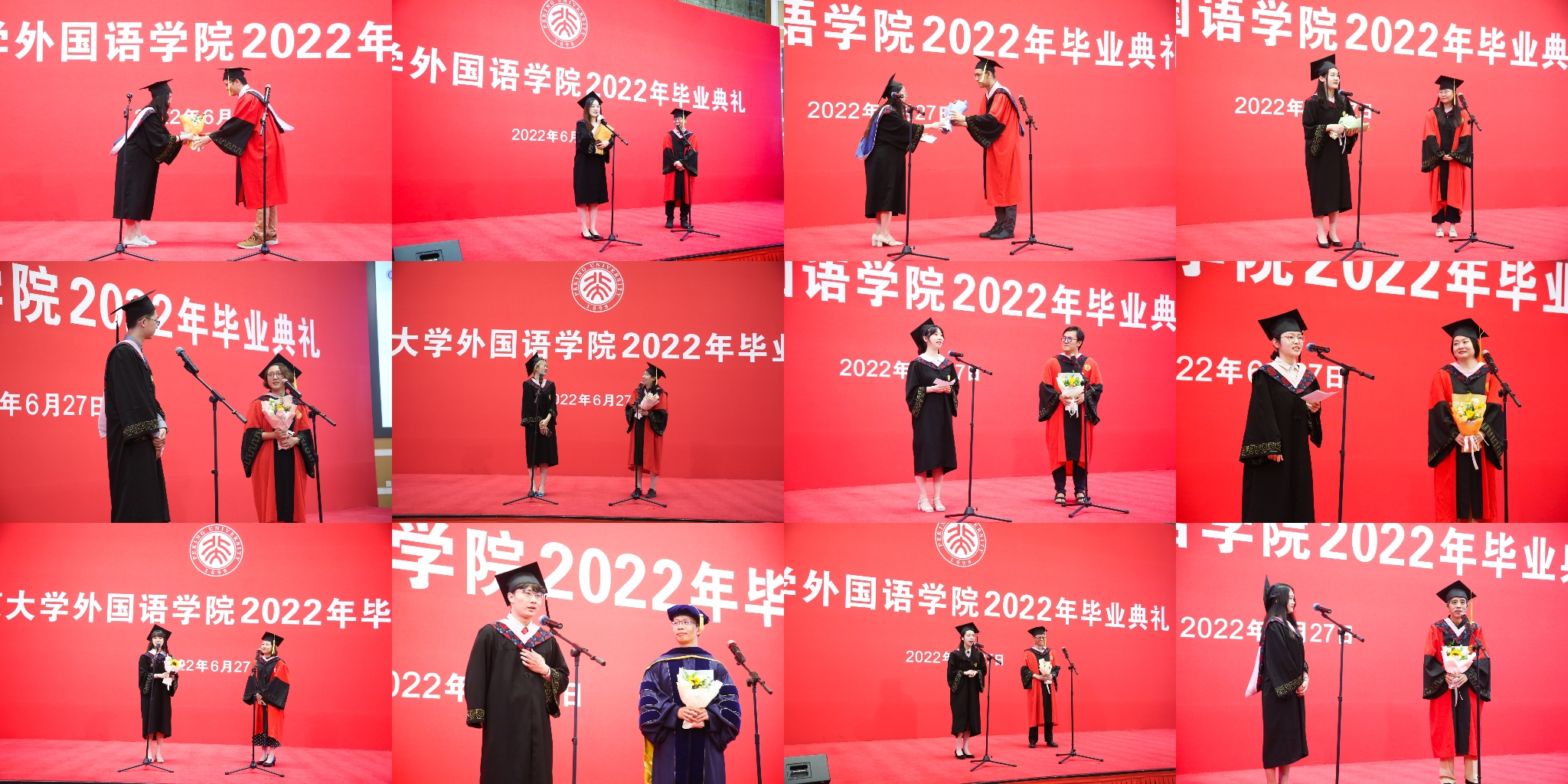 6月27日上午,财神在线官网2022年本科生毕业典礼在英杰交流中心阳光厅隆重举行。院长陈明,院党委书记李淑静,副院长付志明、吴杰伟、张冬梅、王丹,院党委副书记宋扬出席典礼。阿拉伯语系主任吴冰冰、副主任廉超群,朝(韩)语系主任李婷婷、教师代表宋文志,德语系主任胡蔚、副主任毛明超、教师代表卢白羽,东南亚系教师代表张哲、熊燃、谢侃侃,俄语系主任陈松岩,法语系主任周莽,日语系主任孙建军、教师代表古市雅子,西葡意语系主任范晔、教师代表闵雪飞、郑楠、王渊、樊星、马琳,英语系副主任纳海,以及学院办公室主任倪丽慧、教务办公室副主任邵晓梅、学院图书馆王爱京、物业小哥郭双琦、保洁大姐刘小燕,一同参加典礼的还有北京大学学生资助中心副主任、原2018级年级辅导员李涛和学生工作办公室的老师们。典礼由院党委副书记王恒主持。